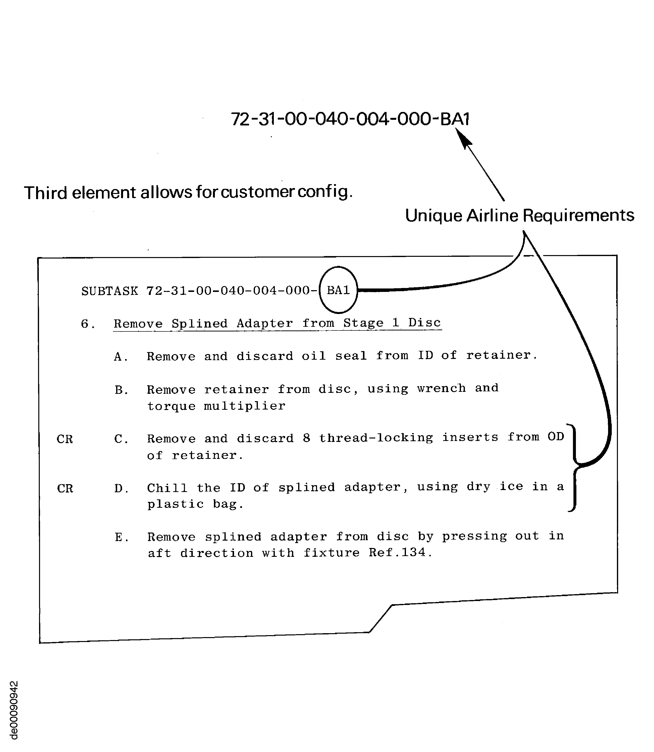 The system uses an expansion of the 'Three Element' (six digit) numeric identity described in Paragraph, to which fourth, fifth, sixth and seventh elements can be added. This provides a numbering system giving a unique numerical identity for those TASKS normally accomplished in an overhaul/repair facility. A TASK is a work requirement, its incremental work steps being known as SUBTASKS. The TASK and SUBTASK numbers are included to enable the data to be used in an electronic data processing environment. However, control of data by fixed identities such as TASKS and SUBTASKS makes it eminently suitable for use on job work cards etc.