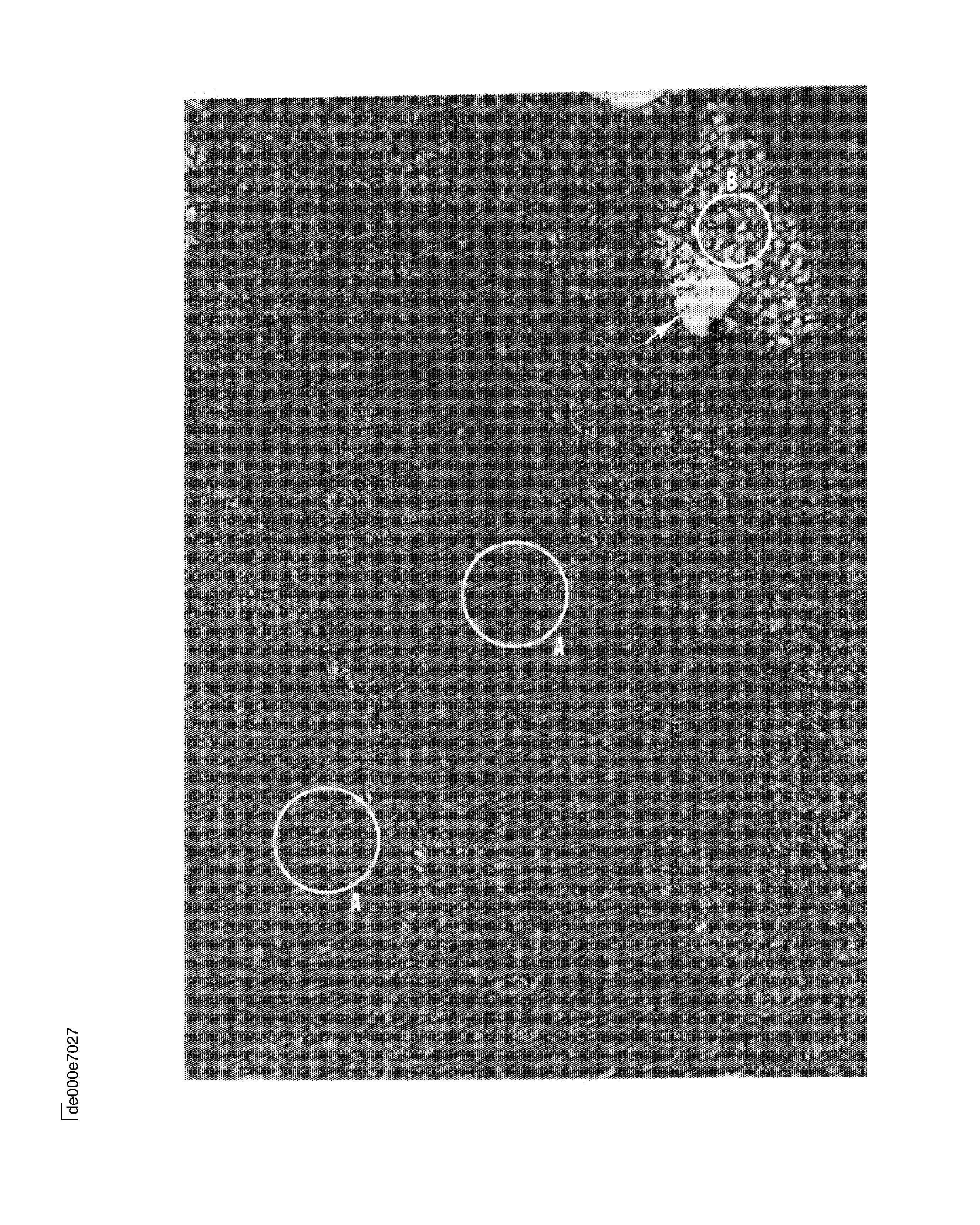 Figure: Microstructure of specification heat treated IAE 1440 single crystal nickel-base alloy that shows a relatively dense uniform array of fine gamma prime precipitate (circles A). A coarse gamma prime precipitate (circle B) and gamma/gamma prime eutectic island (arrow) - Etchant: Mixed acids