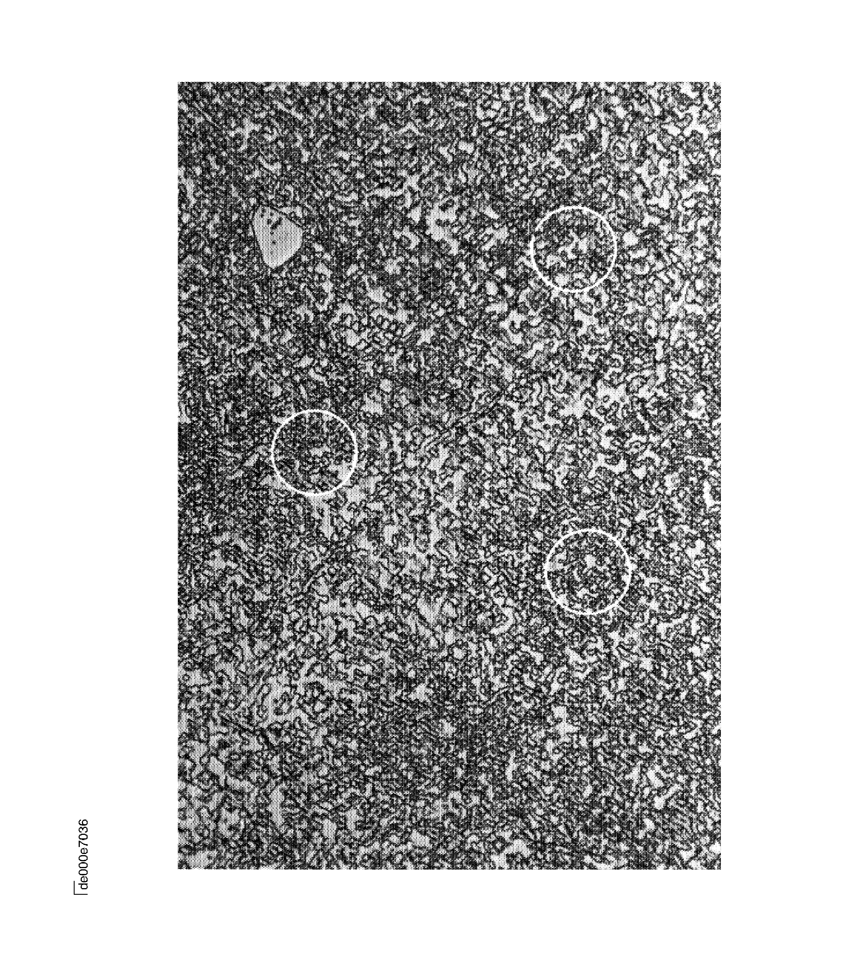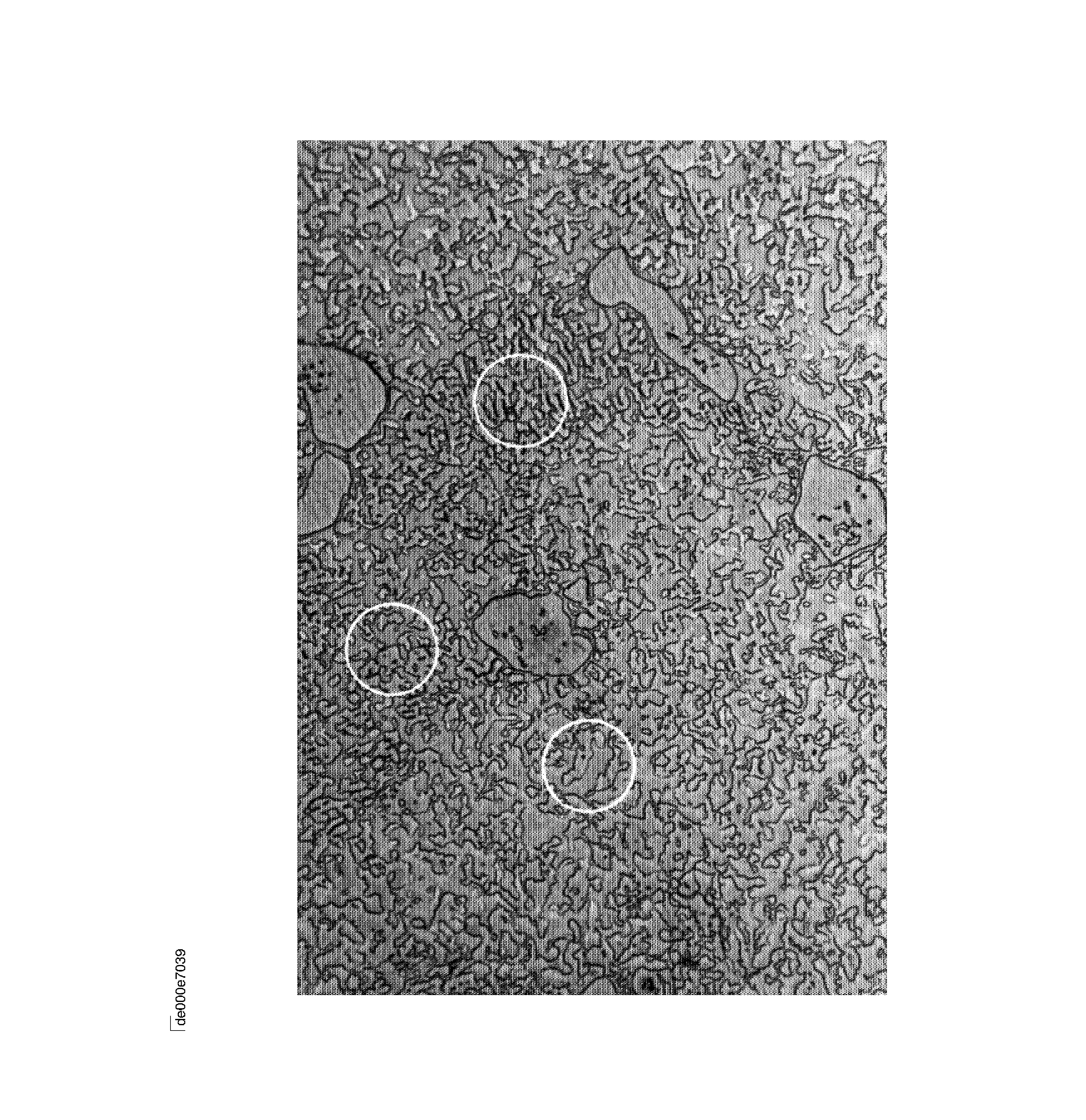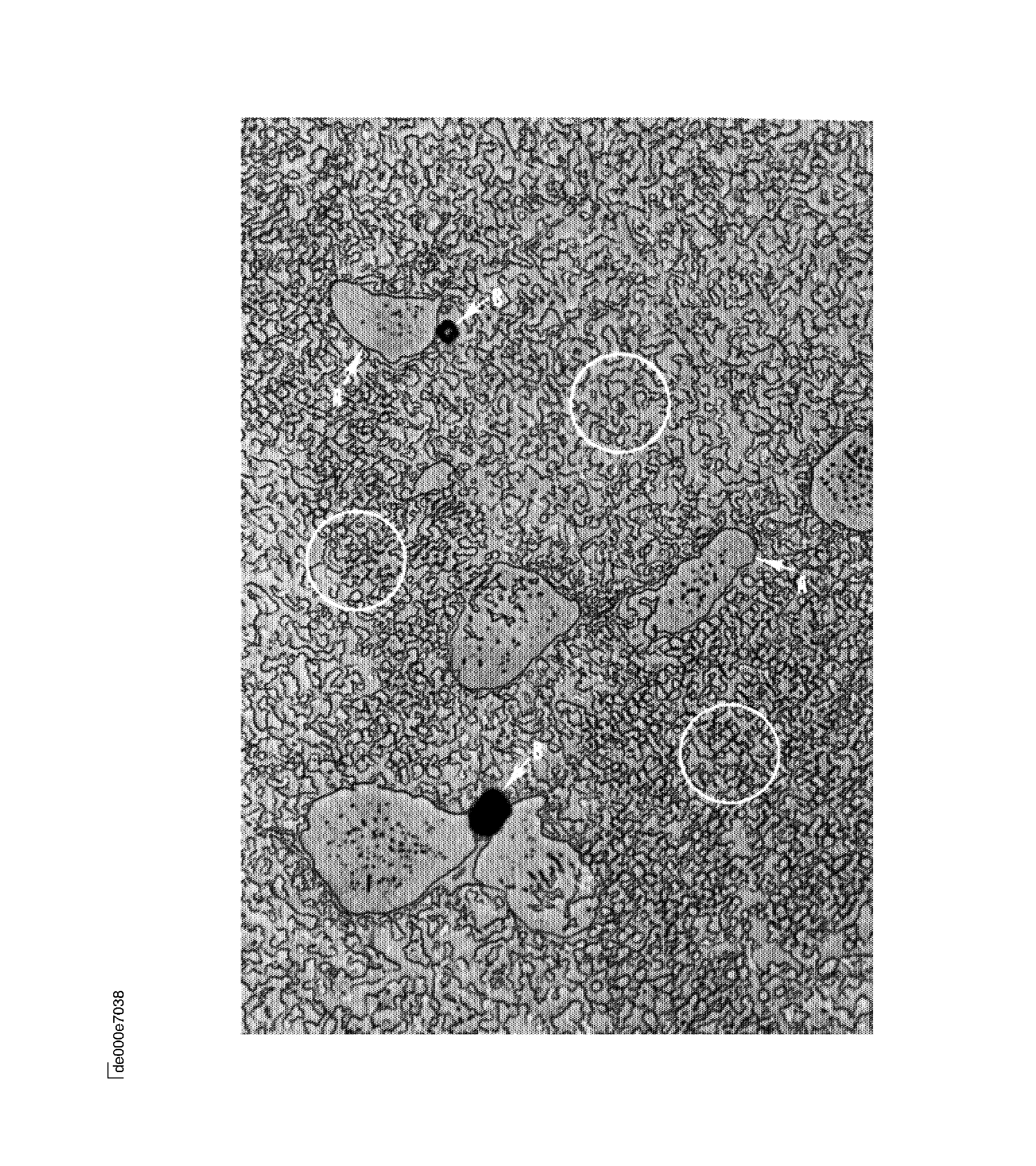Figure: Microstructure of IAE 1440 single crystal nickel-base alloy after exposure to 2200 deg F (1204.4 deg C) that shows solutioning of the gamma prime precipitate is at an advanced stage. The remaining agglomerated gamma prime precipitate is seen as elongated particles arranged in a preferred directional pattern (circles) - Etchant: Mixed acids