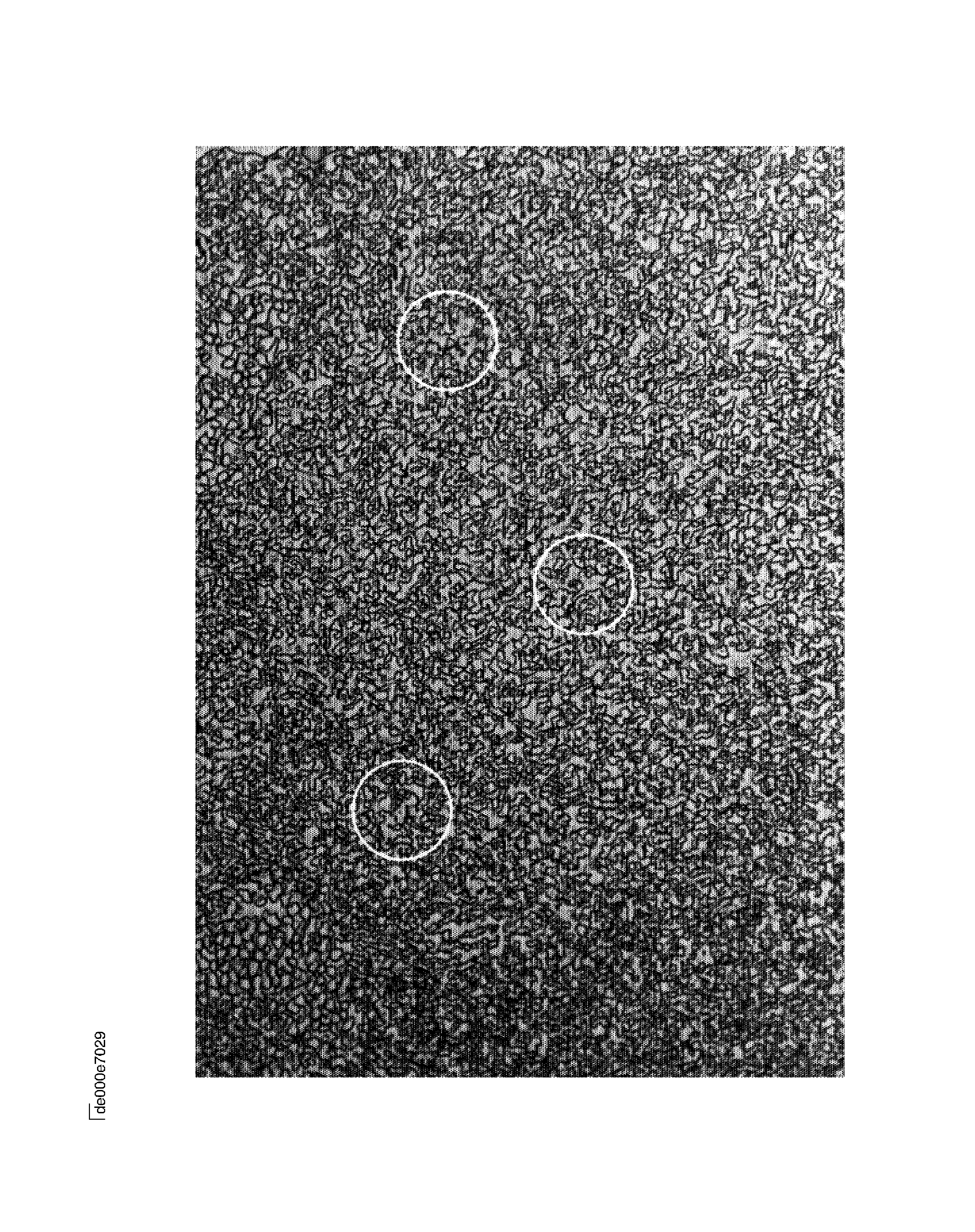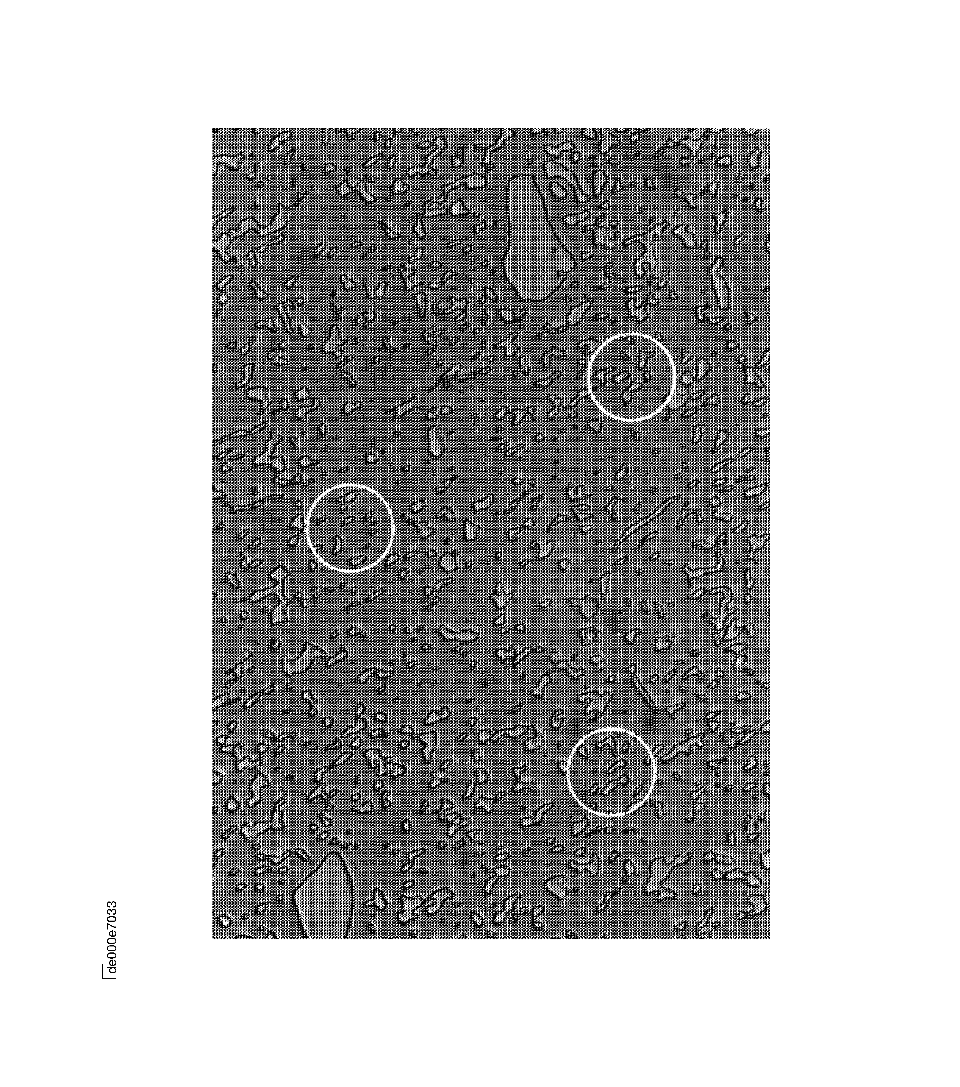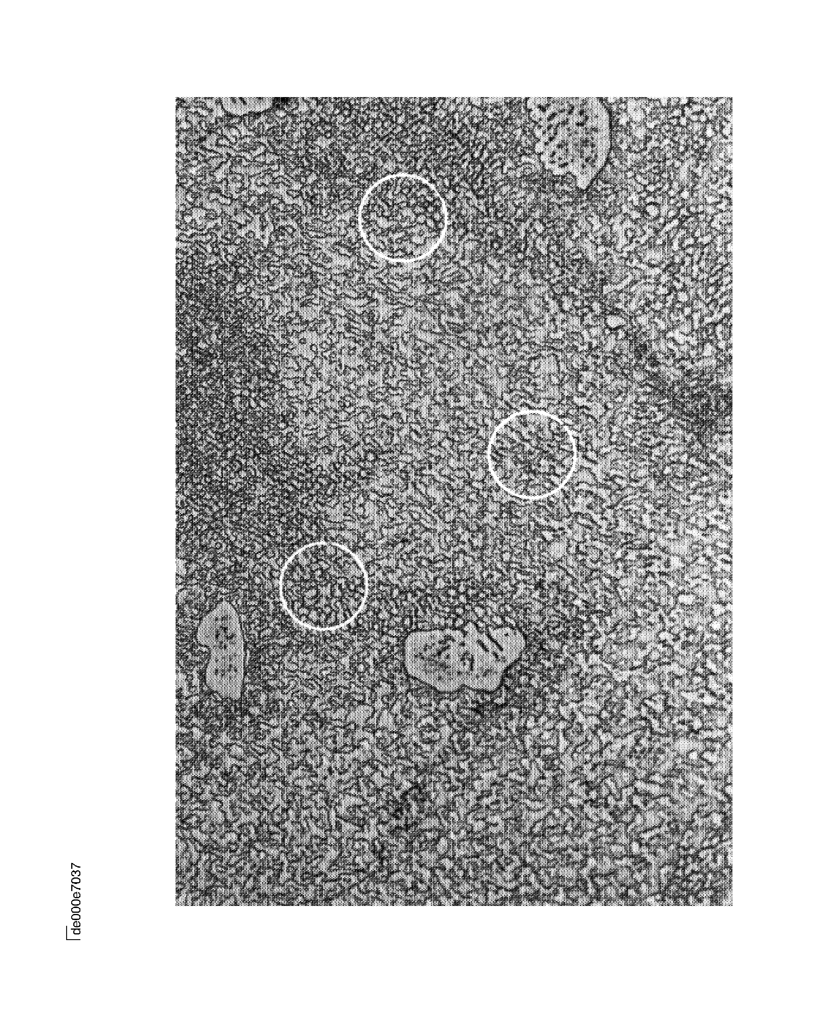 Figure: Microstructure of IAE 1440 single crystal nickel-base alloy after exposure to 2200 deg F (1204.4 deg C) that shows solutioning of the gamma prime precipitate is at an advanced stage. The remaining agglomerated gamma prime precipitate is seen as elongated particles arranged in a preferred directional pattern (circles) - Etchant: Mixed acids