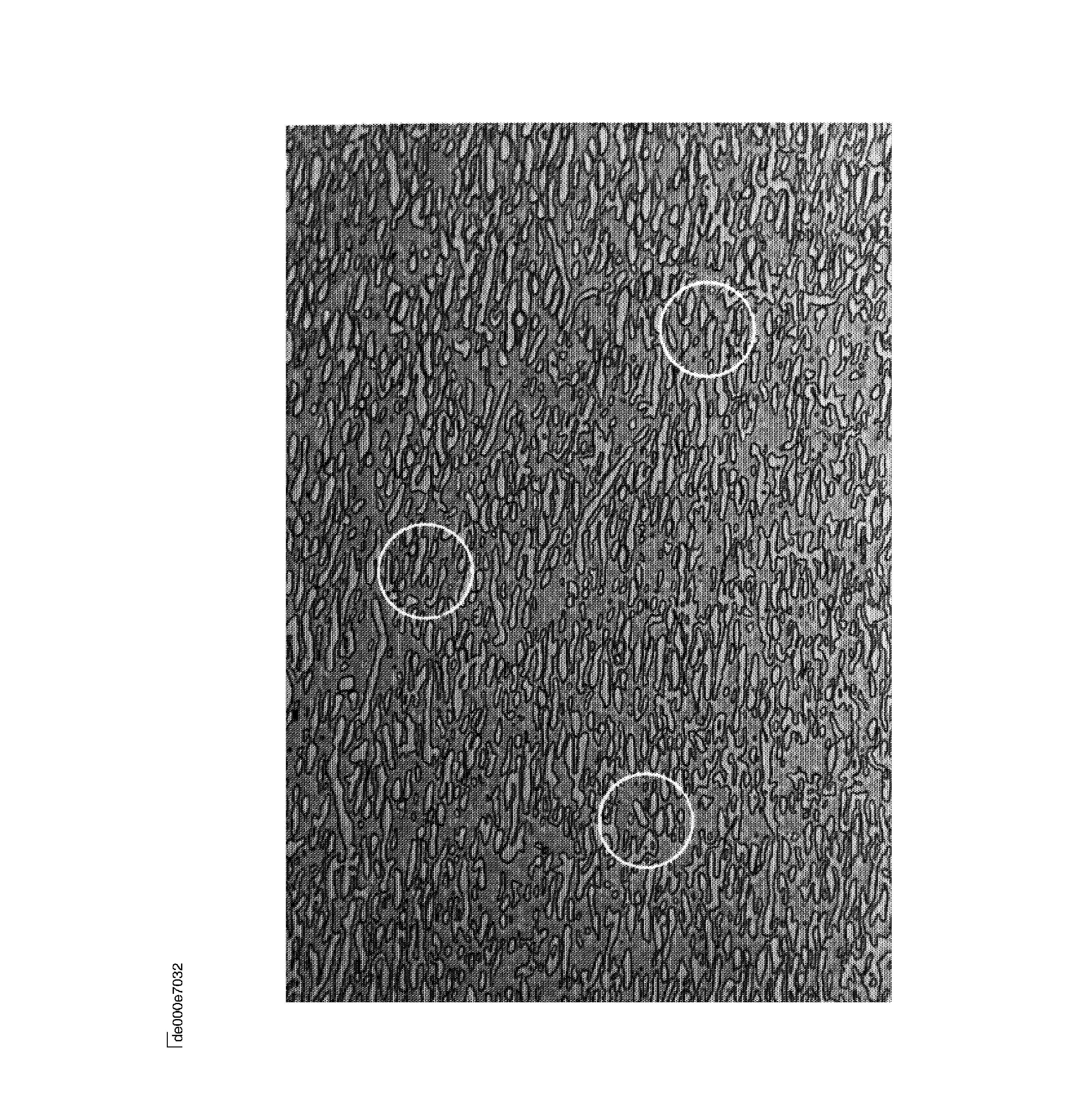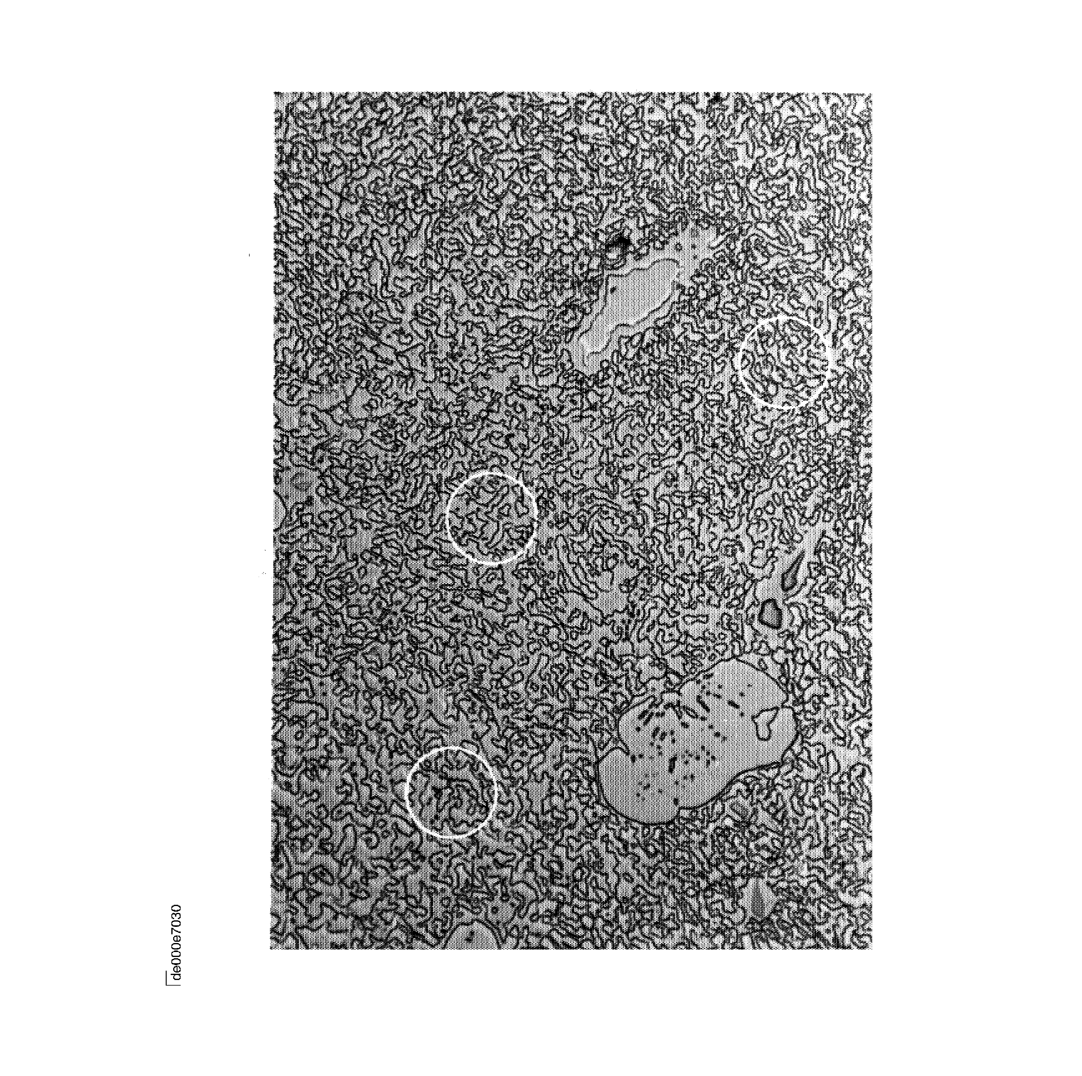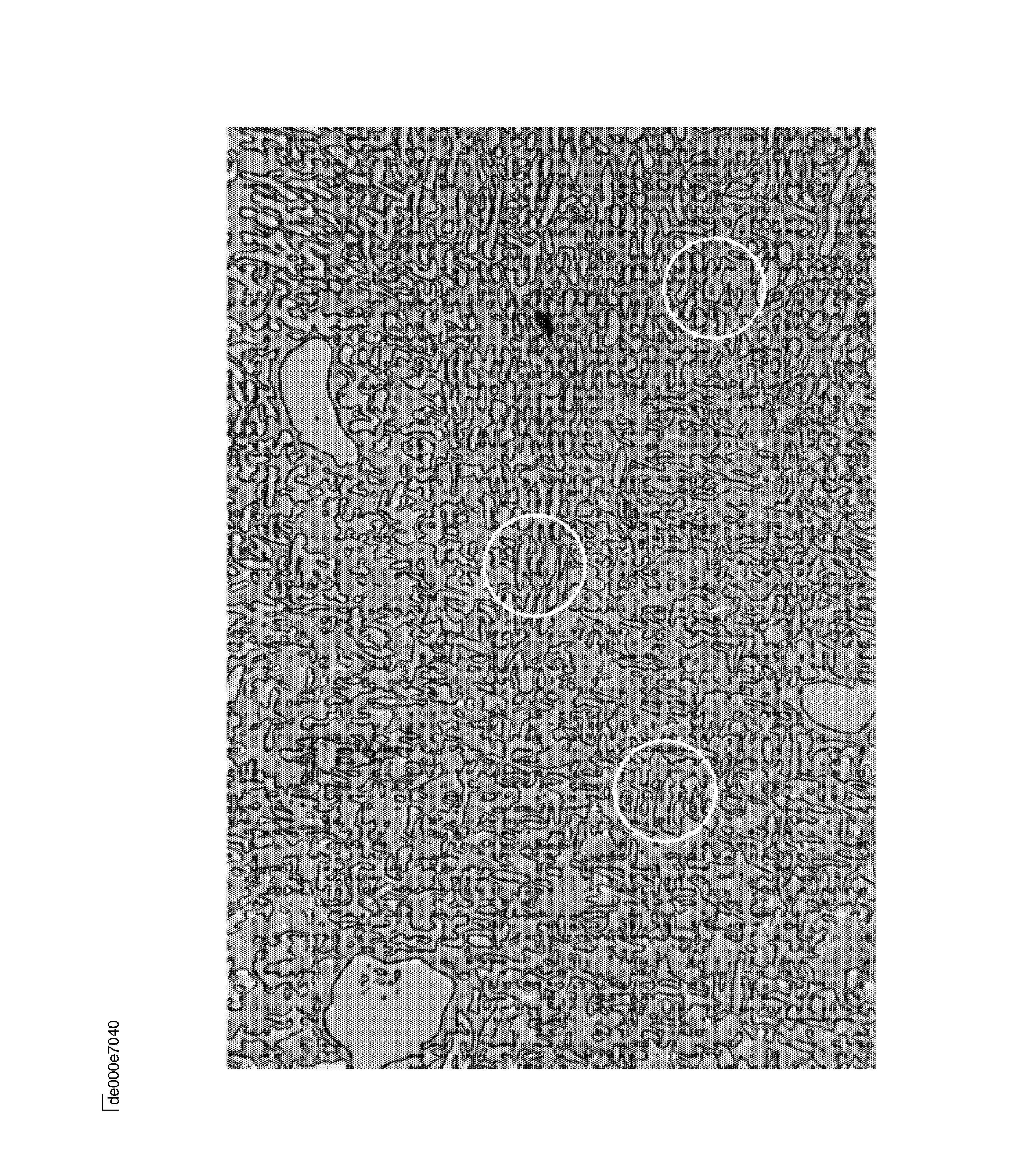 Figure: Microstructure of IAE 1440 single crystal nickel-base alloy after exposure to 2250 deg F (1232.2 deg C) that shows extensive solutioning of the directionally agglomerated gamma prime precipitate (circles) - Etchant: Mixed acids
