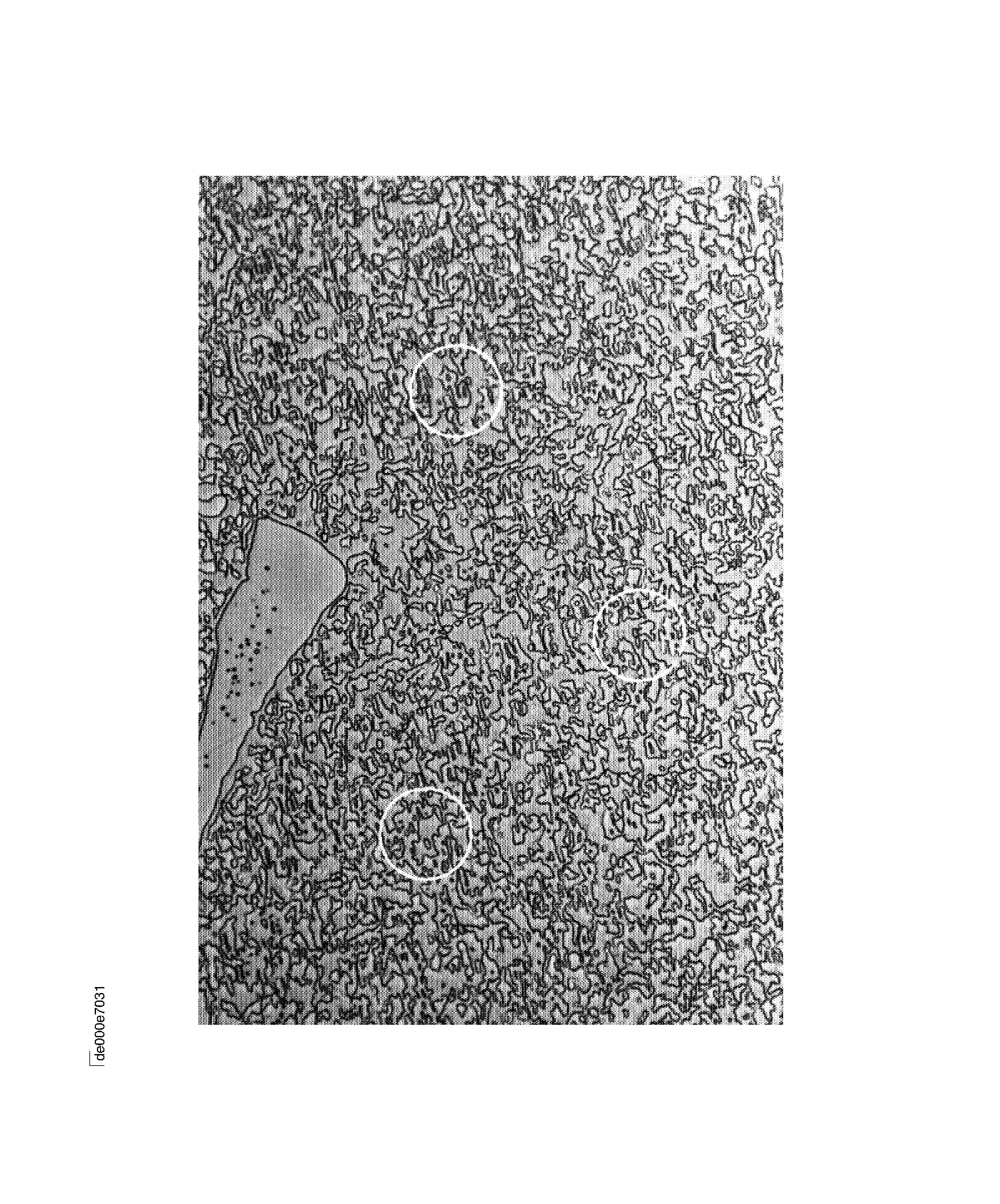 Figure: Microstructure of IAE 1440 single crystal nickel-base alloy after exposure to 2250 deg F (1232.2 deg C) that shows extensive solutioning of the directional agglomerated gamma prime precipitate (circles) - Etchant: Mixed acids
