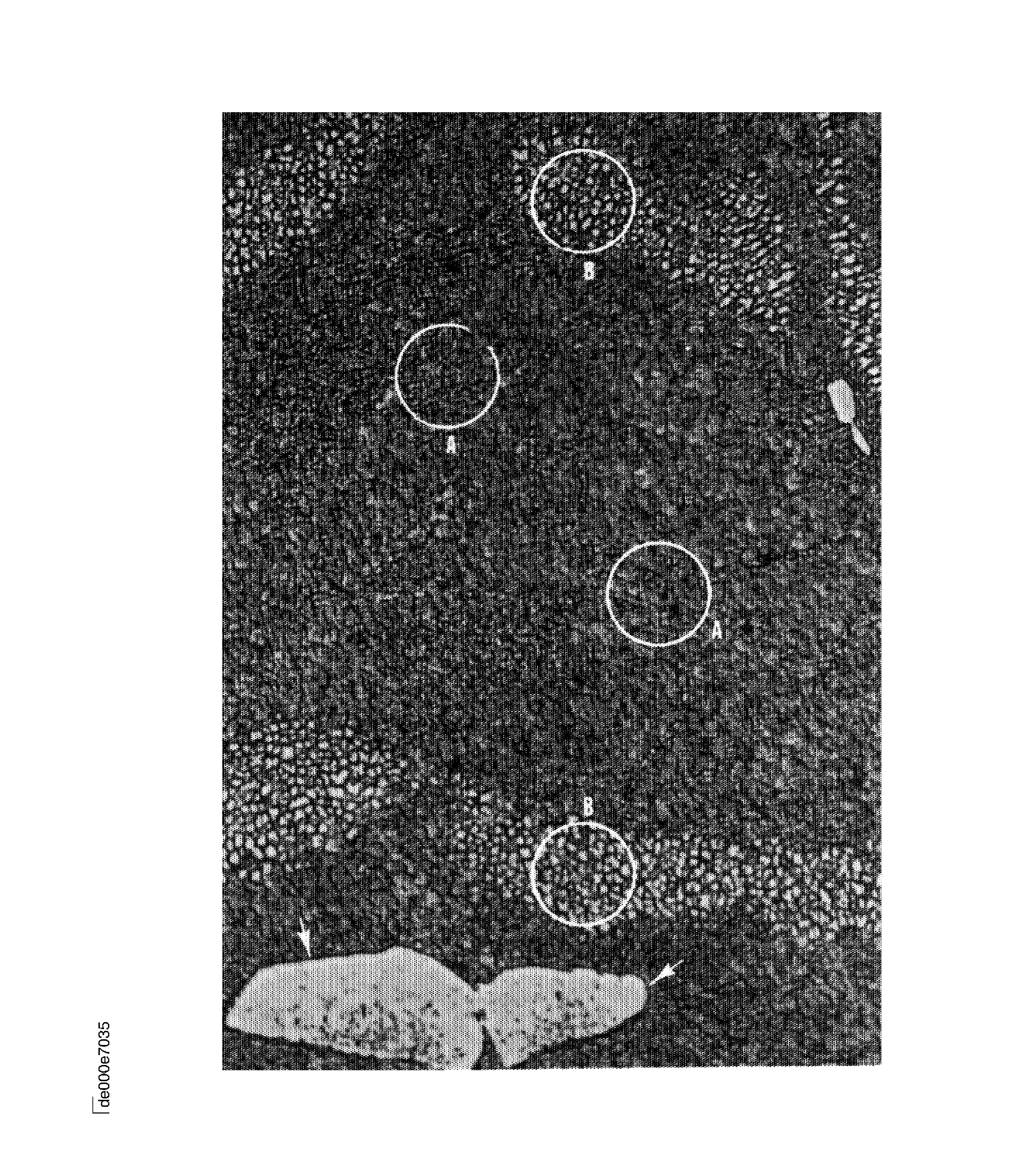 The microstructure of the blade root or shroud sections is not affected due to the relatively low metal temperature obtained during engine operation. This microstructure supplies an optimum baseline for comparison with the airfoil 'hot zone' for metal temperature determination.