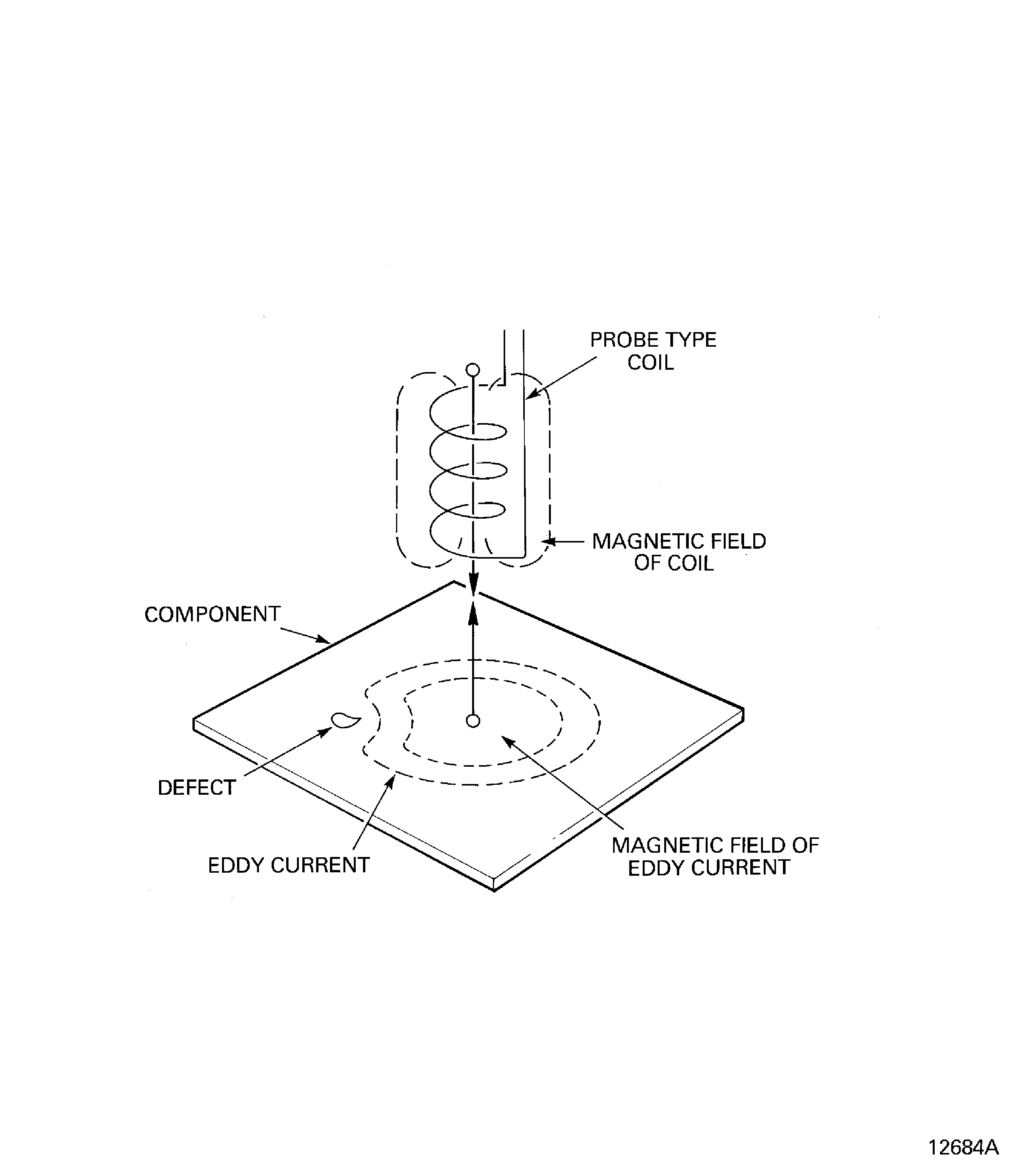 To start eddy currents in the surface of a component; an electrical current of applicable frequency is supplied to a test coil (probe). Refer to Figure. The coil causes a magnetic field of the same frequency which makes eddy currents in the component. A defect in the component changes the intensity of the eddy current which also has an effect on the magnetic field; this effect changes the condition of the test coil (probe). An electronic analysis can be made of the changes in the condition of the probe. These changes can be seen on an analog meter or a cathode ray tube display.