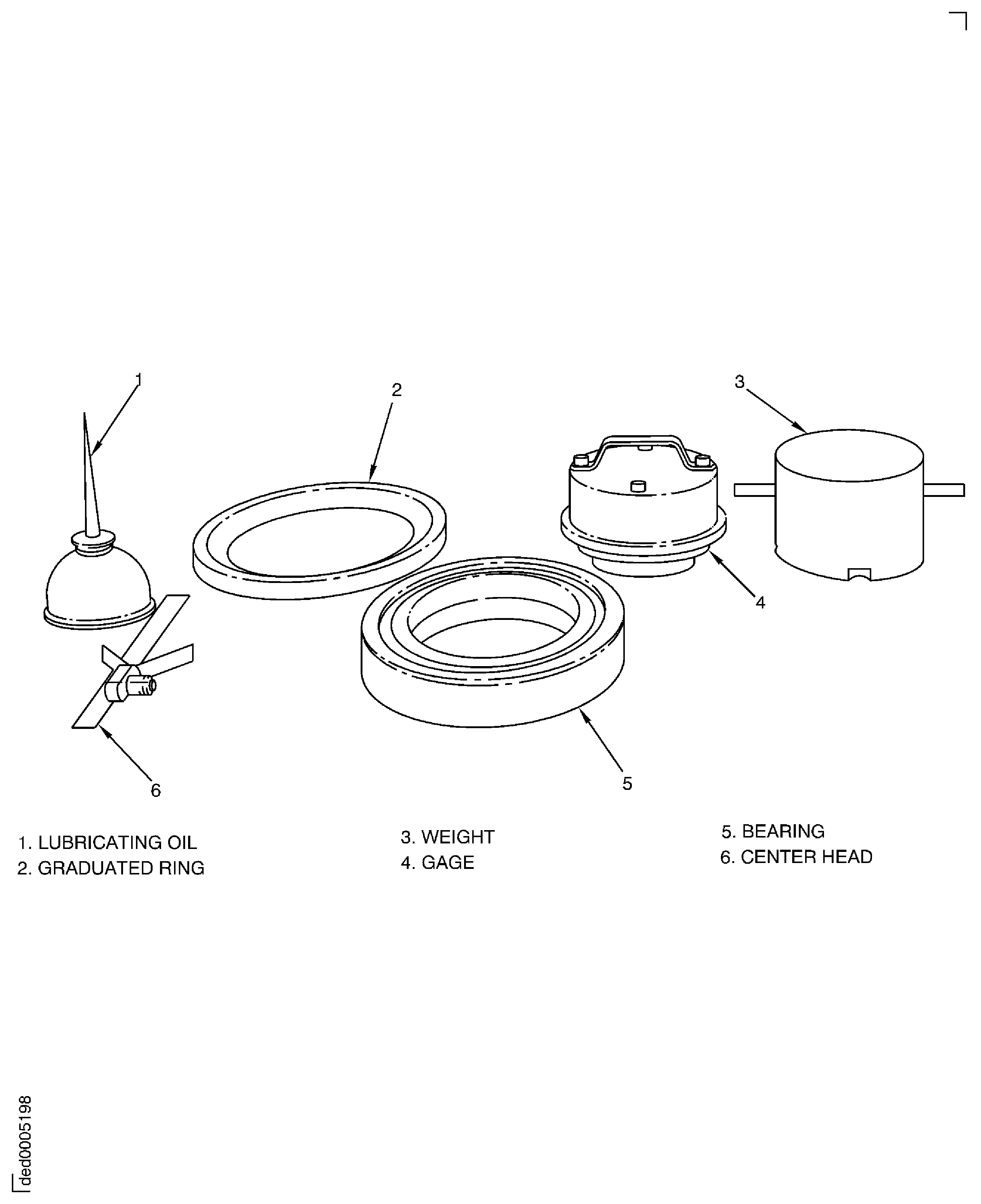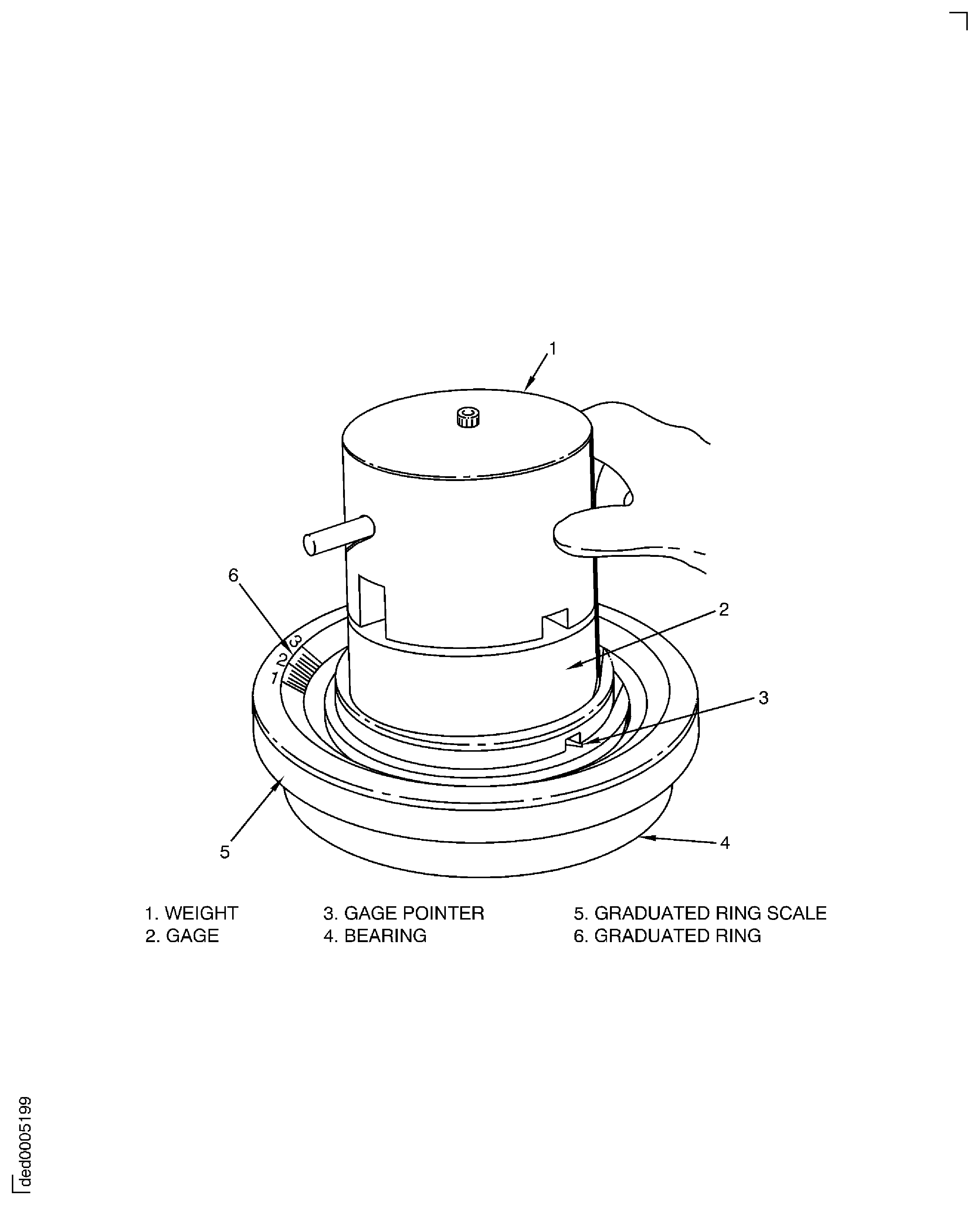 Aligning pointer of gage with zero mark of graduated ring and previously applied mark on cage, rotate weight clockwise exactly ten revolutions. See Figure.