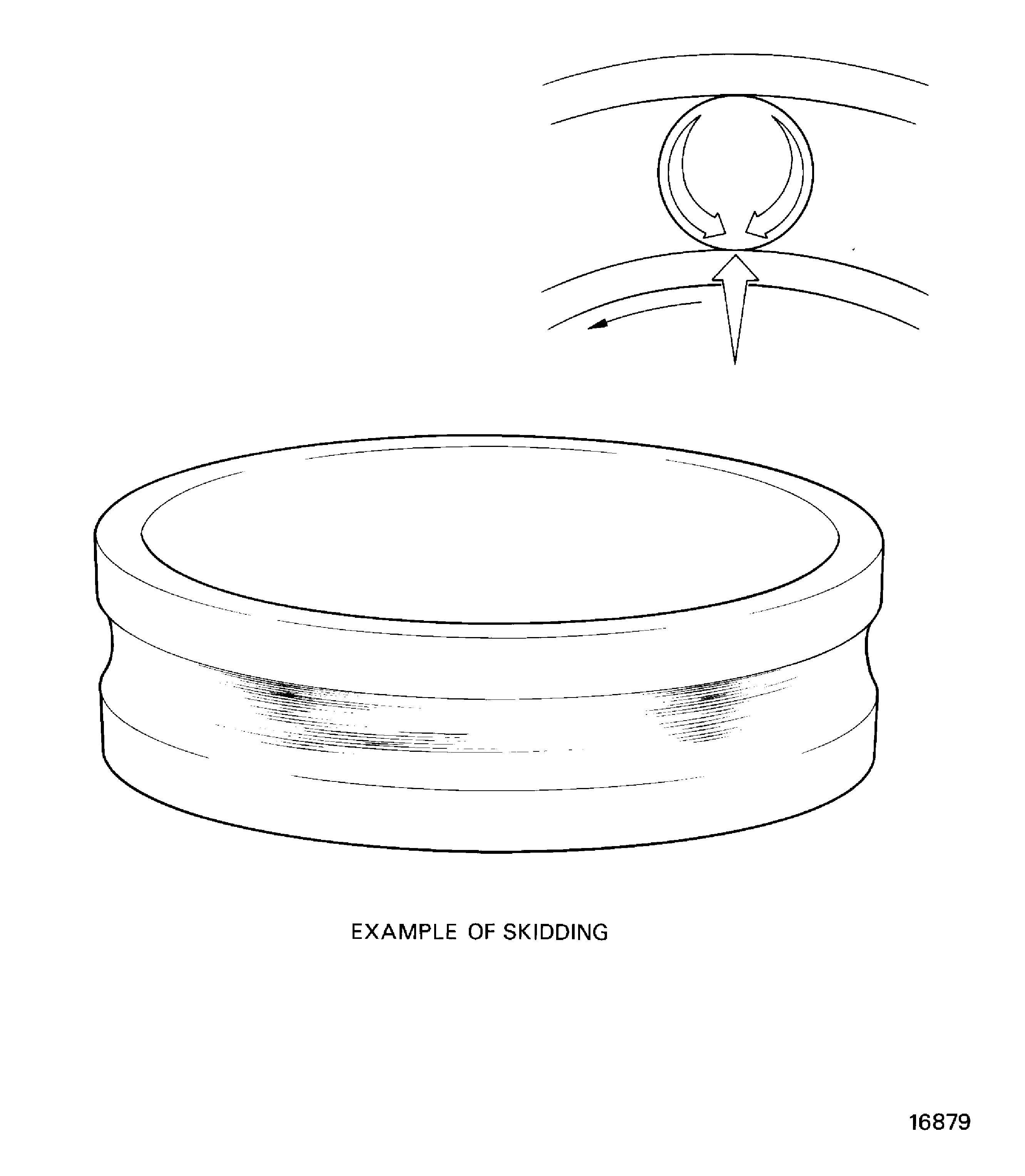 Definition and description - Too much slipping between balls or rollers and raceways. Skidding is seen on rollers as a burnished or frosted ring around the rollers and/or raceways. On ball bearings it is seen as a speckled pattern or a burnished or frosted ring on the balls and as burnished, irregular frosted or smeared areas on the inner race. Heavy cage pocket wear is frequently a symptom of skidding.
