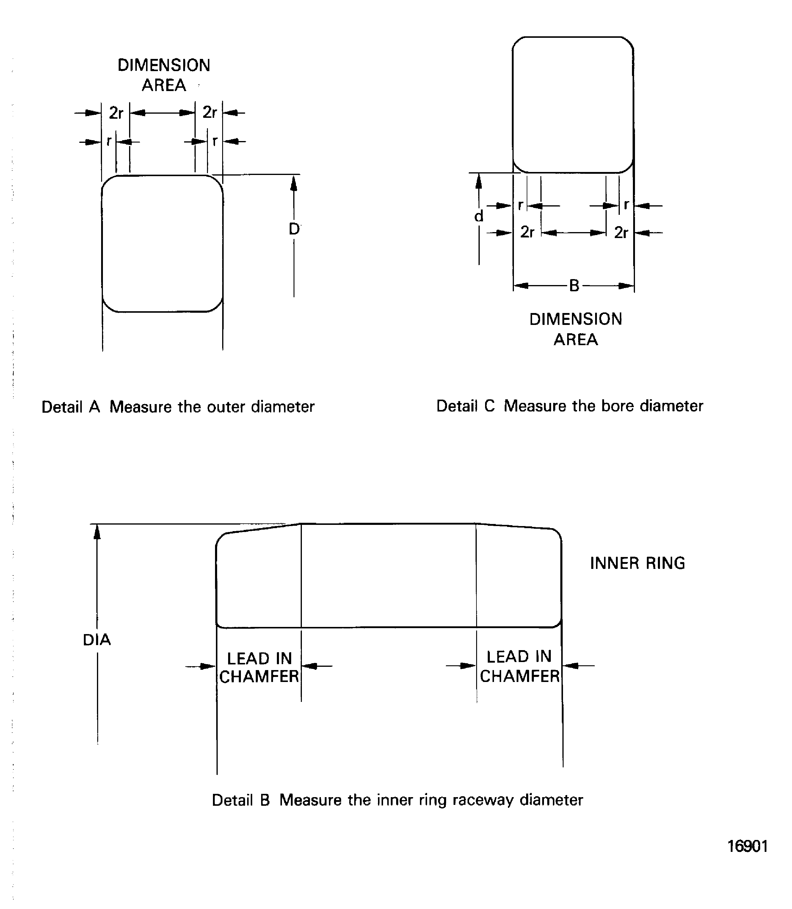Measure the inner race outer diameter of roller bearings that come apart, refer to Figure, Detail B.