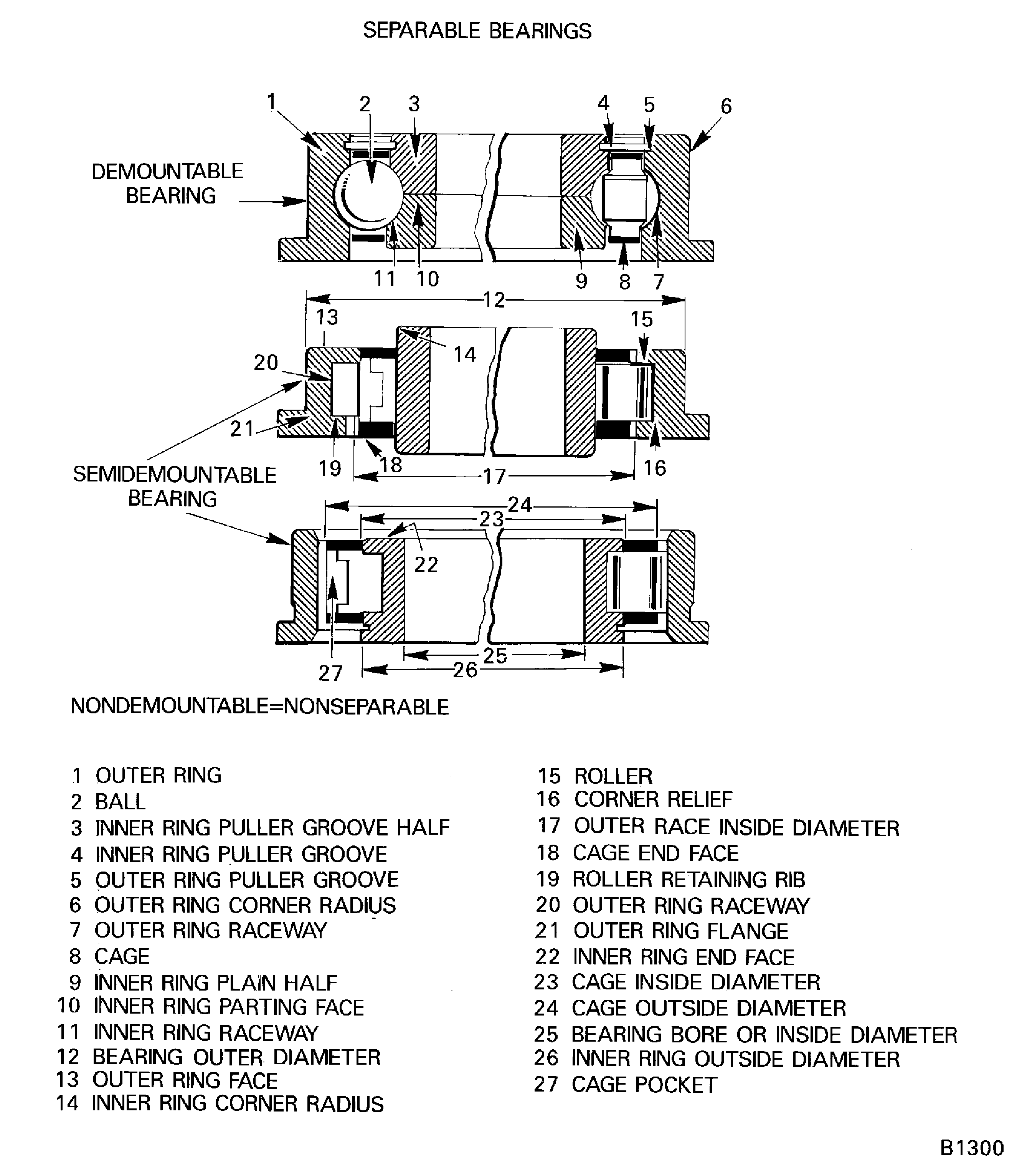 The names given to the bearing components, shown in Figure have been agreed with the Anti-friction Bearing Manufacturers Association (AFBMA). Always use these names in all inspection reports.
