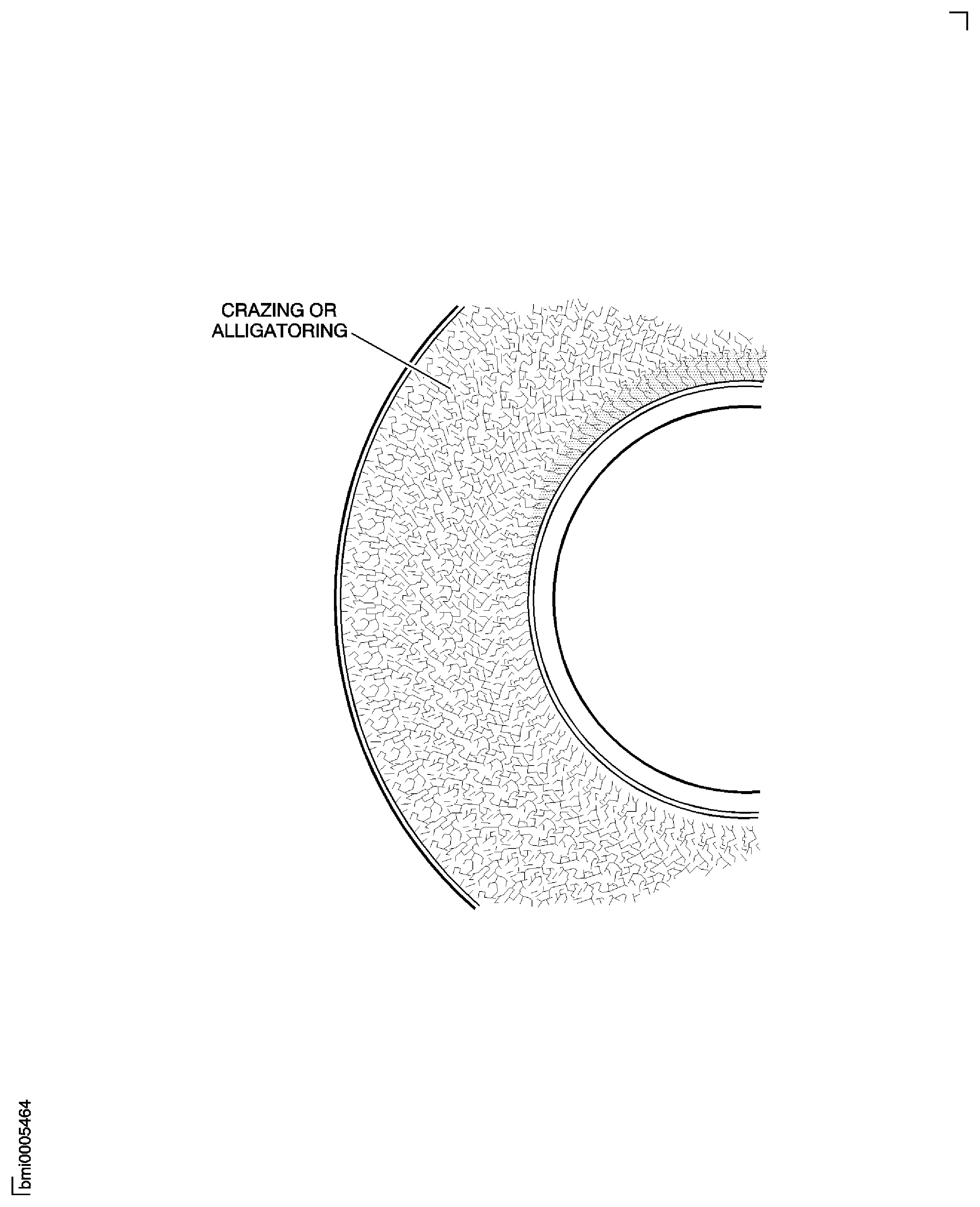 The definition of a crack in this procedure is a fracture in the chromium plate. Minute cracks are those that require magnification or special lighting effects, such as oblique lighting, to be discernible. Magnification and such special lighting would be required to observe the typical minute cracking shown in Figure.Where Outer Diameter plating encompasses fewer than two circumferential grooves per inch of part length, chipping at the edge of the chromium plate is permitted if the chipped area extends not more than 0.0469 in. (1.19 mm) back from an edge, and the edge shows no chipping on 75 percent of the groove circumference.