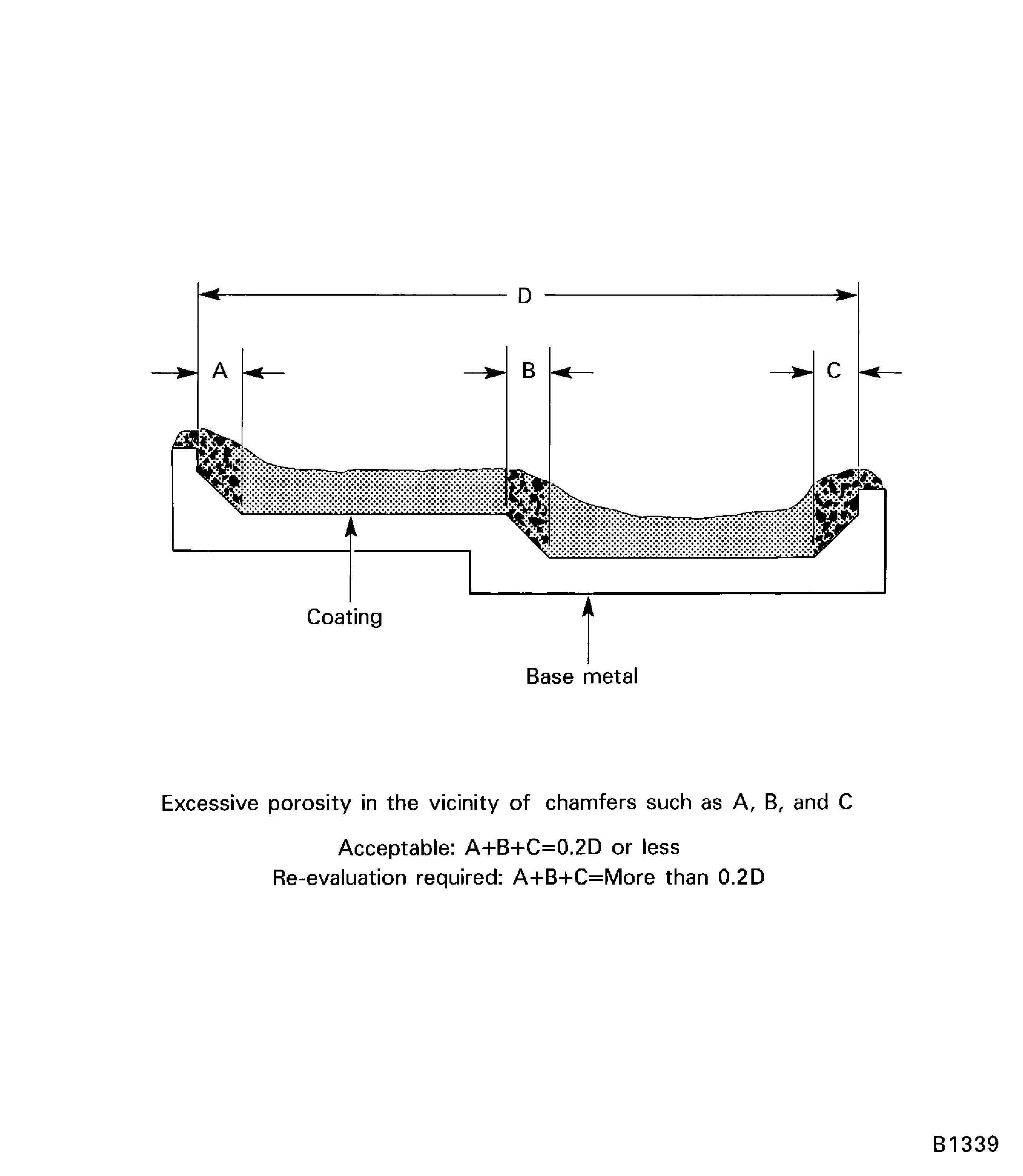 Figure: Diagram showing porosity criteria for PWA 74-1 and PWA 74-2 coating adjacent to chamfers