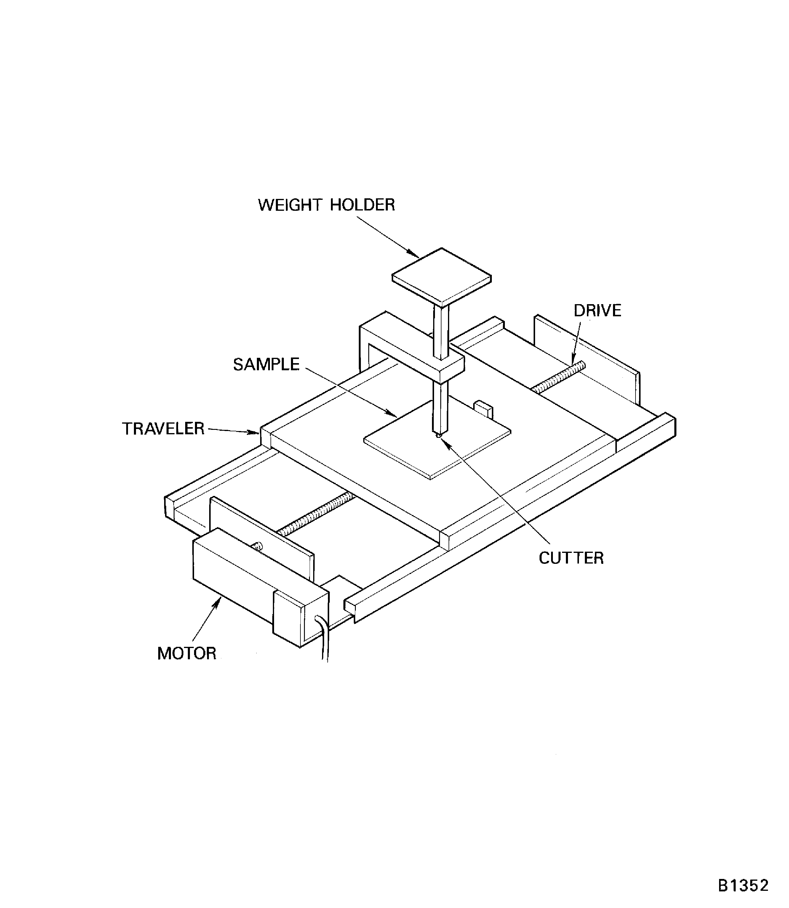 This tester has a traverse table with stops to hold the test block during the test. The traverse table must have a motor drive that can move the table in the traverse direction at approximately 1 foot/minute (0.3 m/minute), and the range of travel must be more than 0.75 in. (19 mm).