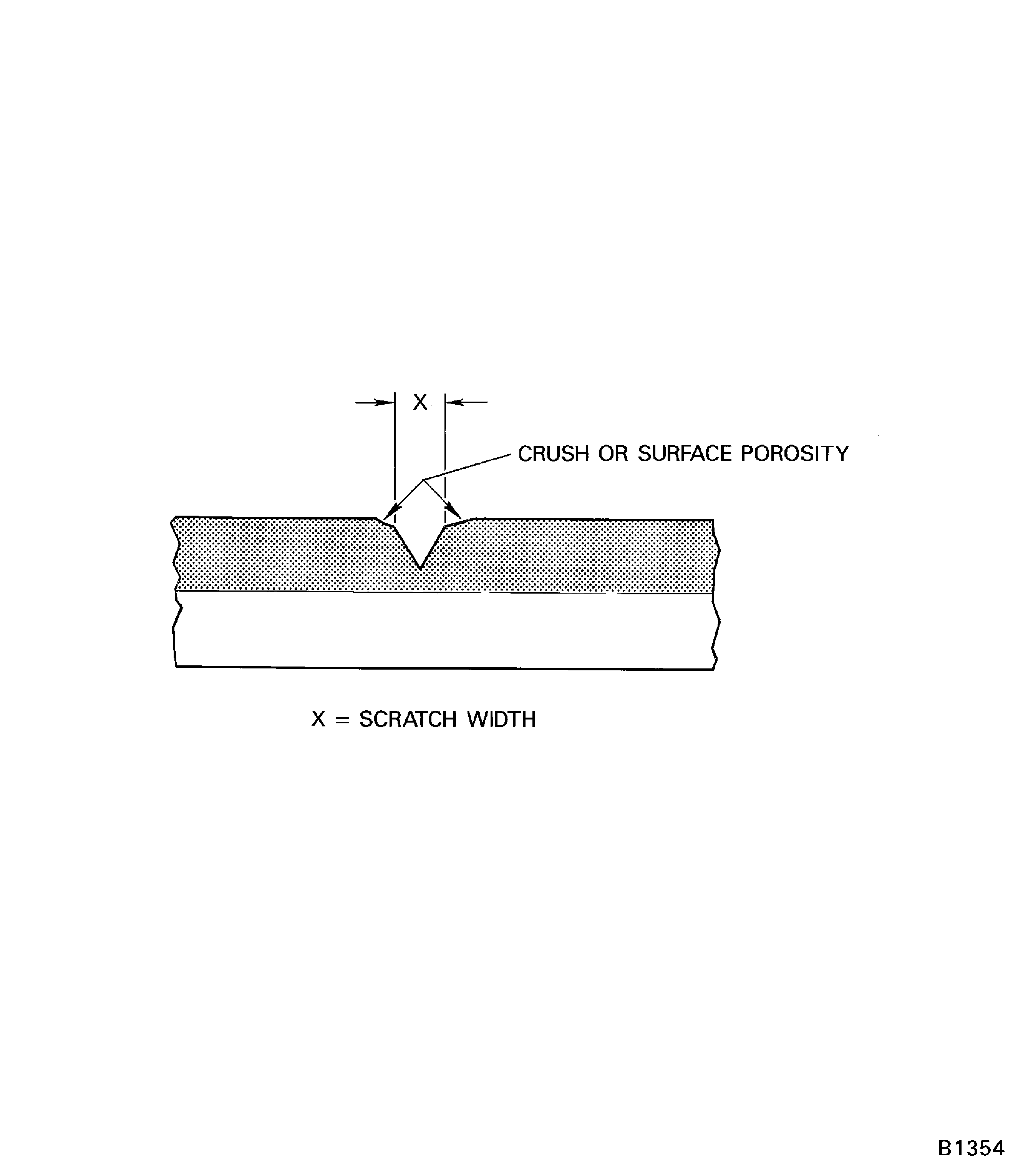 Measure width (x) of scratch to nearest 0.002 in. (0.051 mm) in several places with Brinell microscope, refer to Figure. Do not include area of crush, surface porosity, or area within 2.5 scratch widths of any specimen containing vertical supports.
