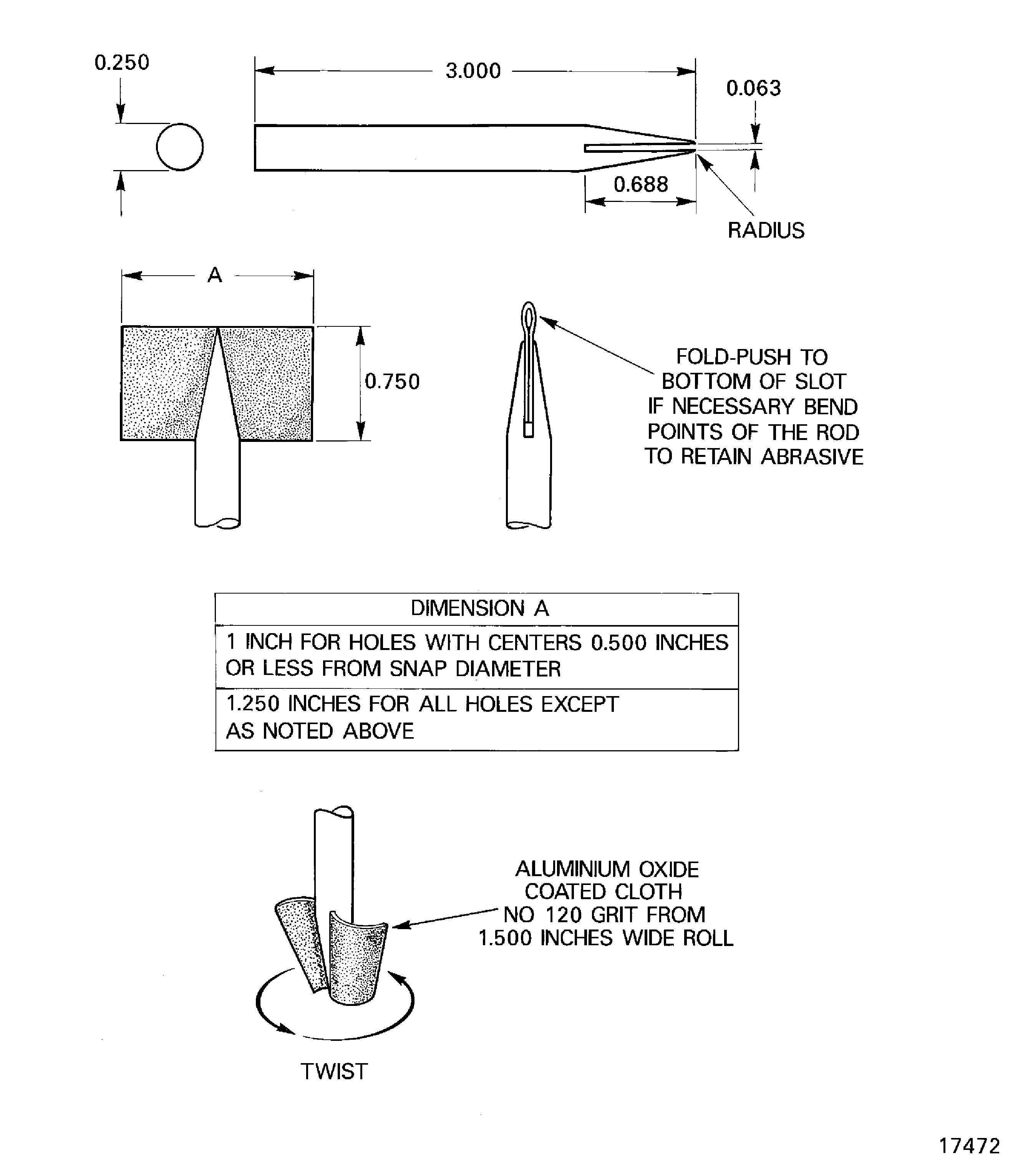 Size of abrasive cloth must be held to within 0.0625in. of specified size and must be pushed to the bottom of the slot. Abrasive cloth must be held satisfactorily in slot in spindle. It is permitted to bend points of spindle together to improve the grip on the abrasive cloth.Cut abrasive cloth to size of 1.250 inches as indicated in Figure. Fold, insert in spindle with abrasive side open, and twist firmly in direction indicated (opposite direction of spindle rotation).