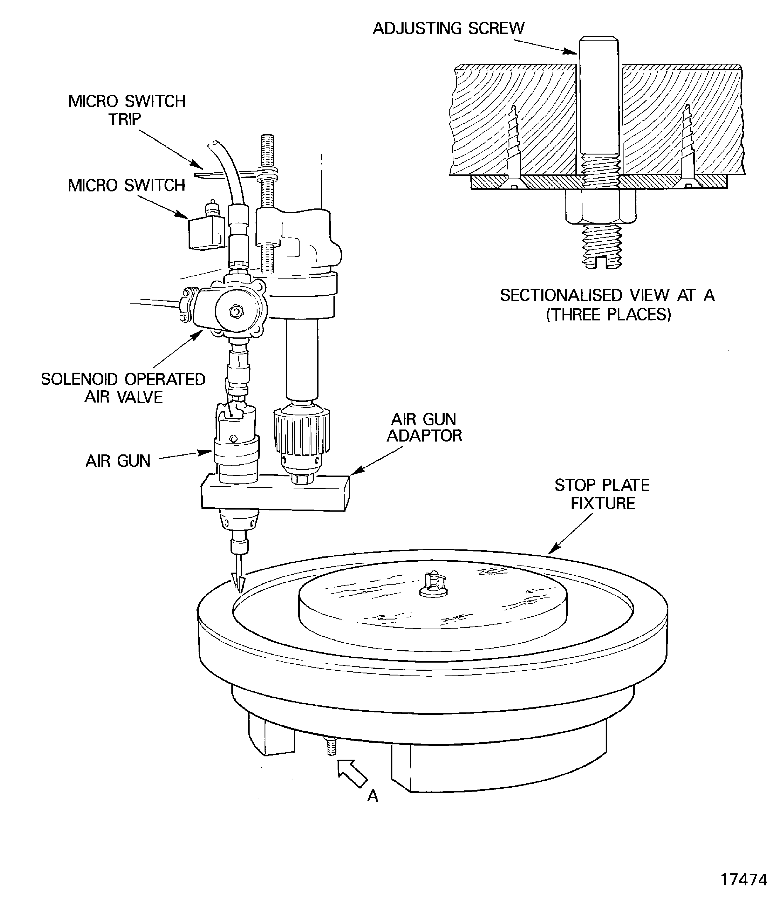 Automatic timers and limit switches can be used to start and stop air gun if necessary.Start air gun and lower spindle into hole the necessary depth of penetration. Raise and lower spindle in reciprocating stroke of about 0.0625 in. at rate of two strokes a second. Time necessary will be approximately 6 to 12 seconds (or as necessary) to produce a blended radius for each hole.