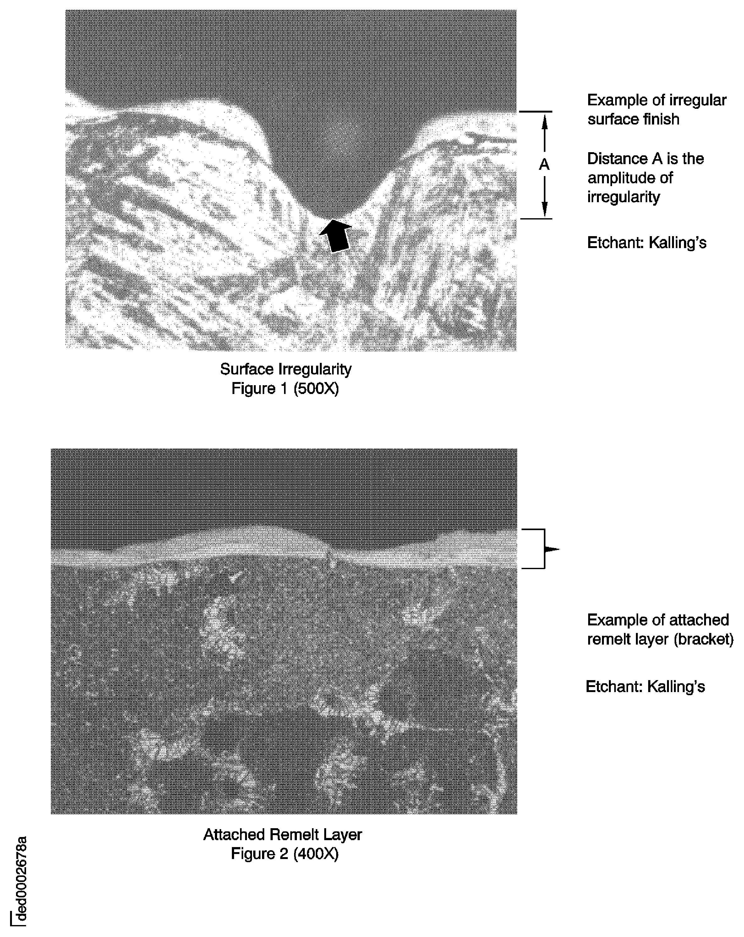 Surface irregularity measurement is applicable only to the attached remelt layer and is to include redeposited remelt particles securely bonded to the attached remelt layer. See Figure Figure 8A. Surface irregularity is not applicable to turbine airfoil and platform cooling holes.Surface Irregularity.