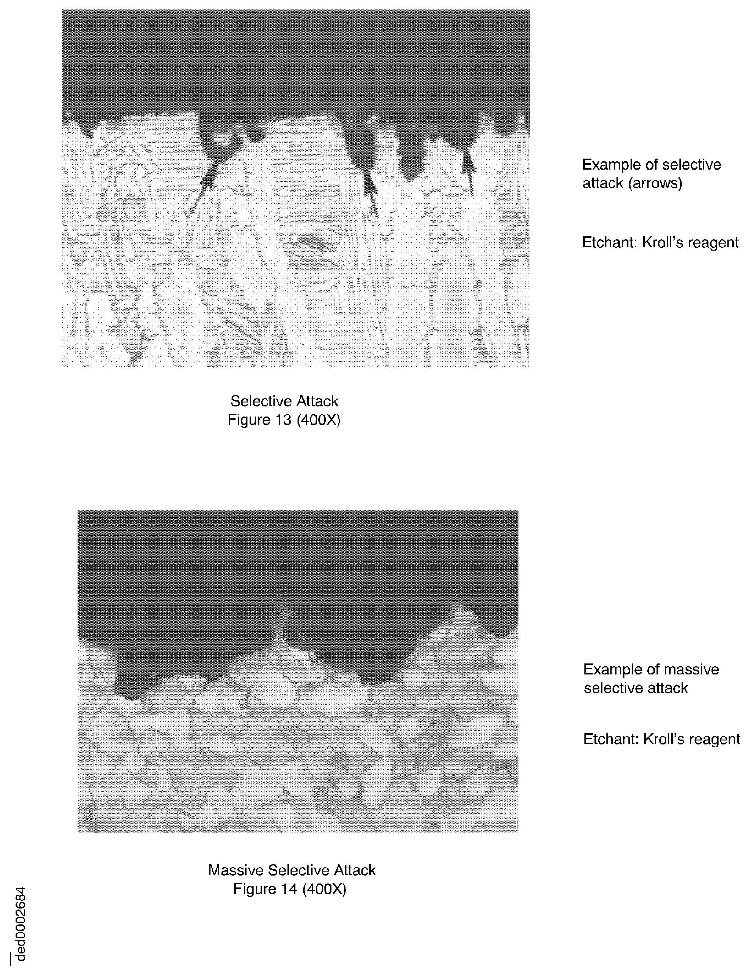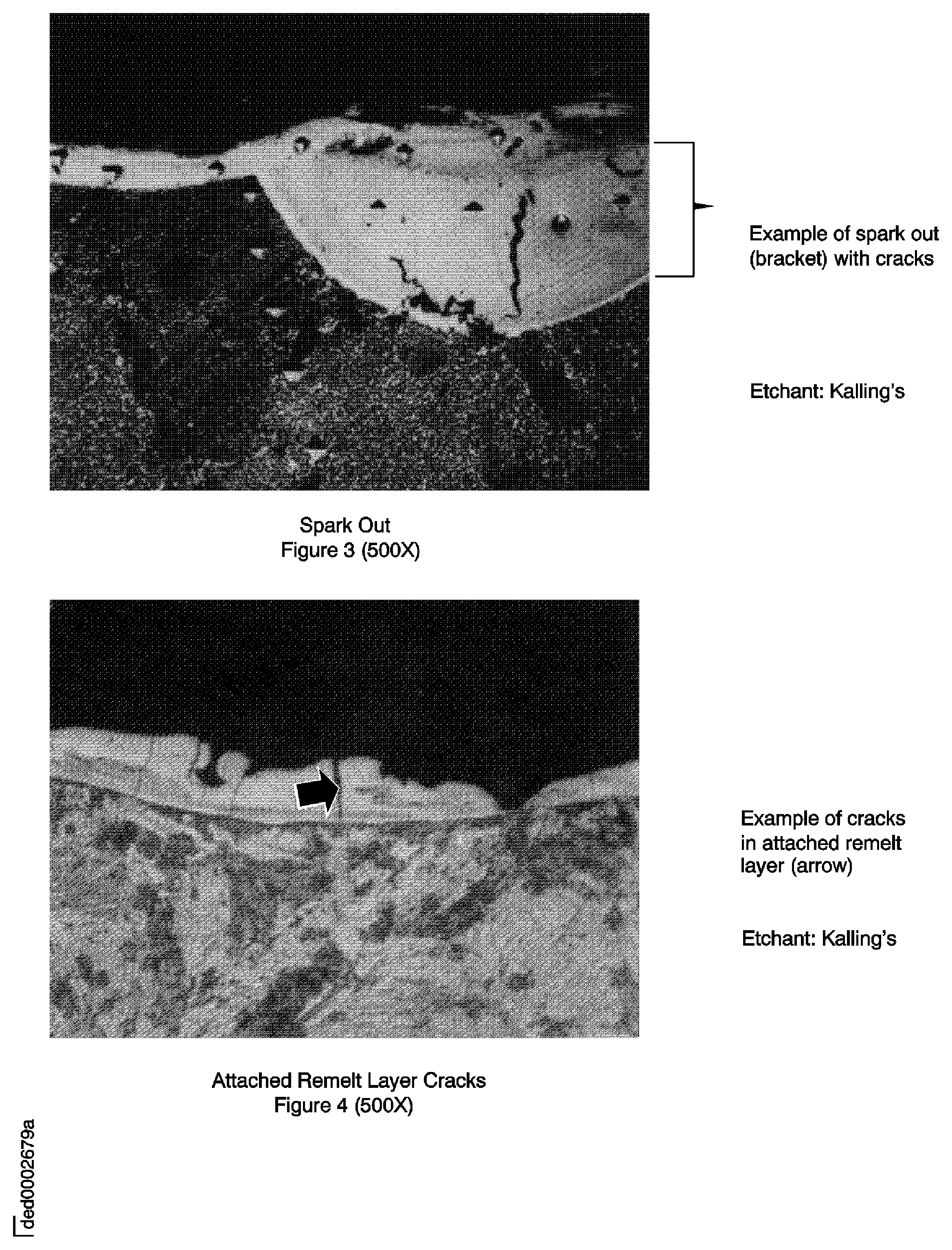 Refer to Figure (Remelt Cracks and Cracked Carbides), and Figure (Cracked Borides) and 7A (Crack in eutectic gamma prime).