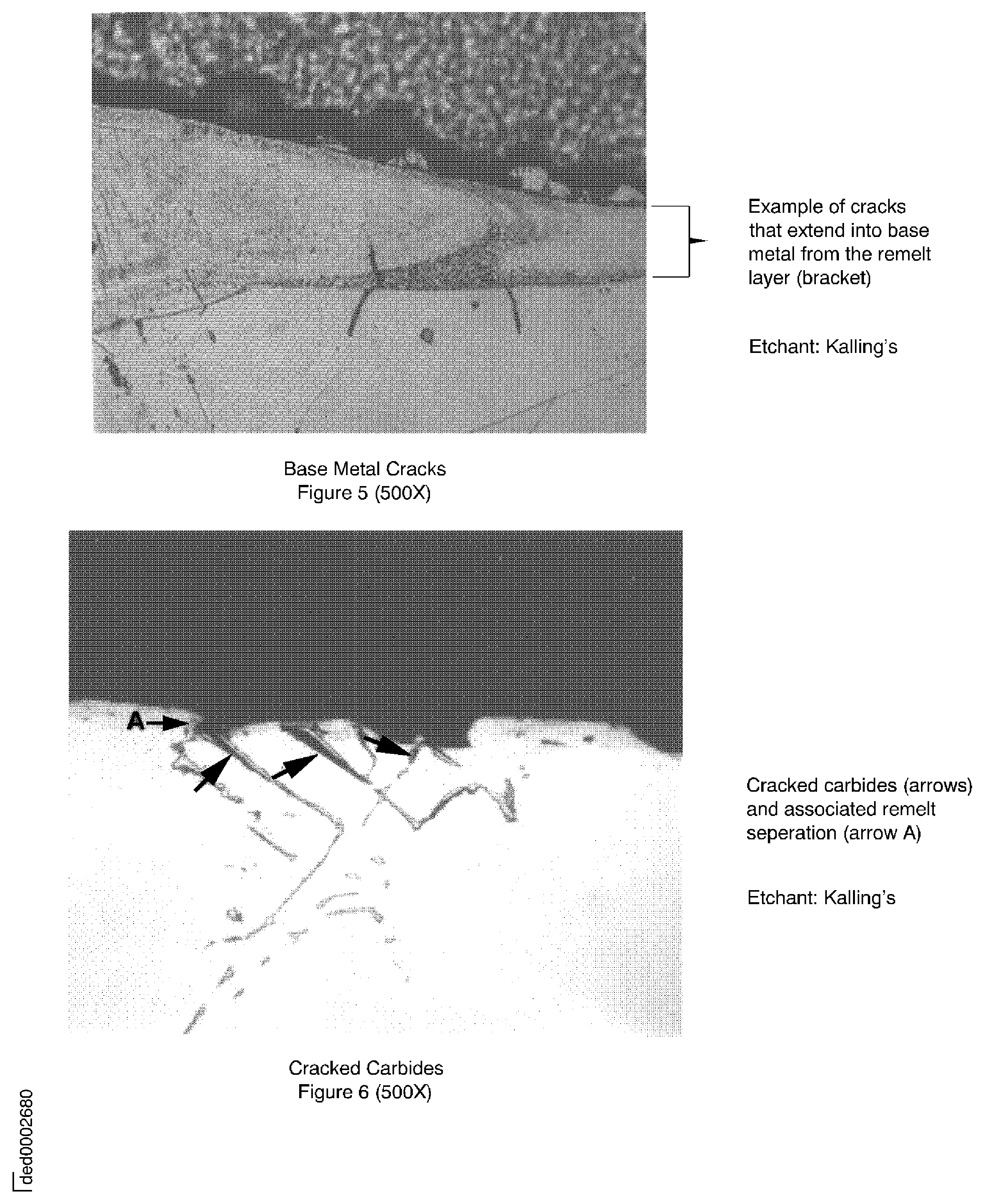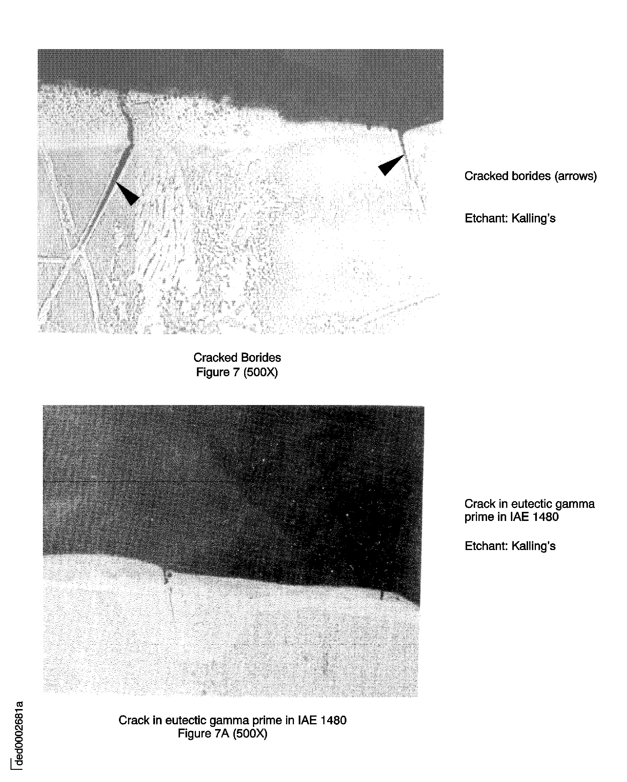 Refer to Figure (Base Metal Cracks and Cracked Carbides), and Figure (Cracked Borides) and Figure 7A (Crack in eutectic gamma prime).