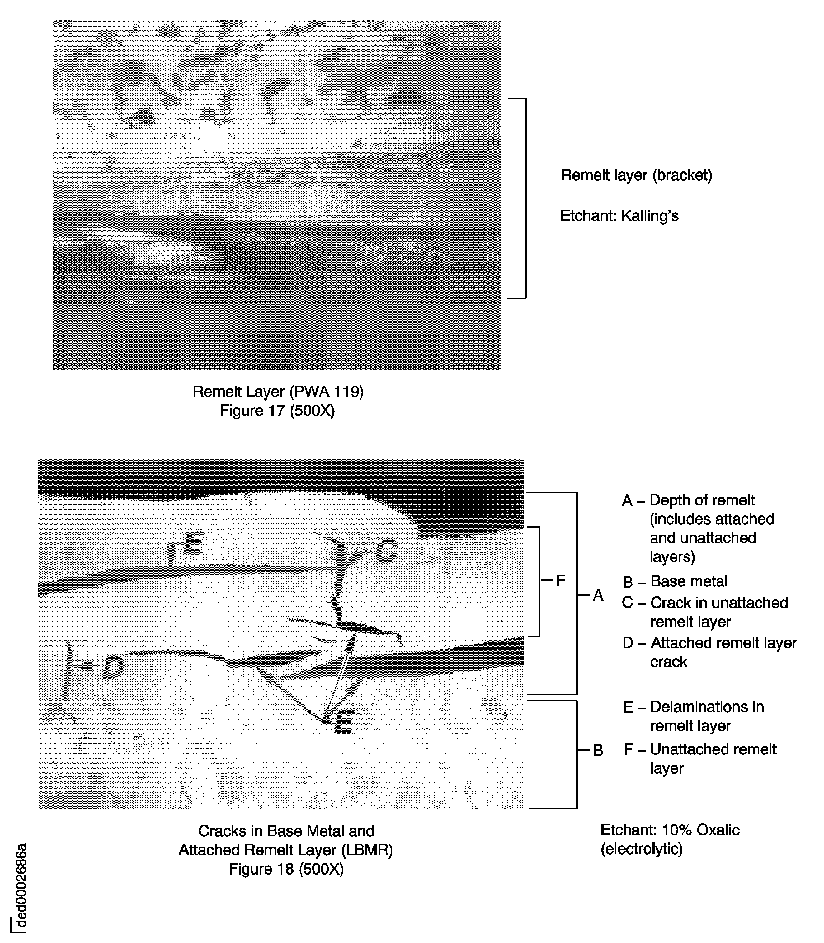 Read and report remelt layer as predominant and maximum conditions that permit isolated indications up thru 0.0025 inch (0.064 mm) as an acceptable condition.