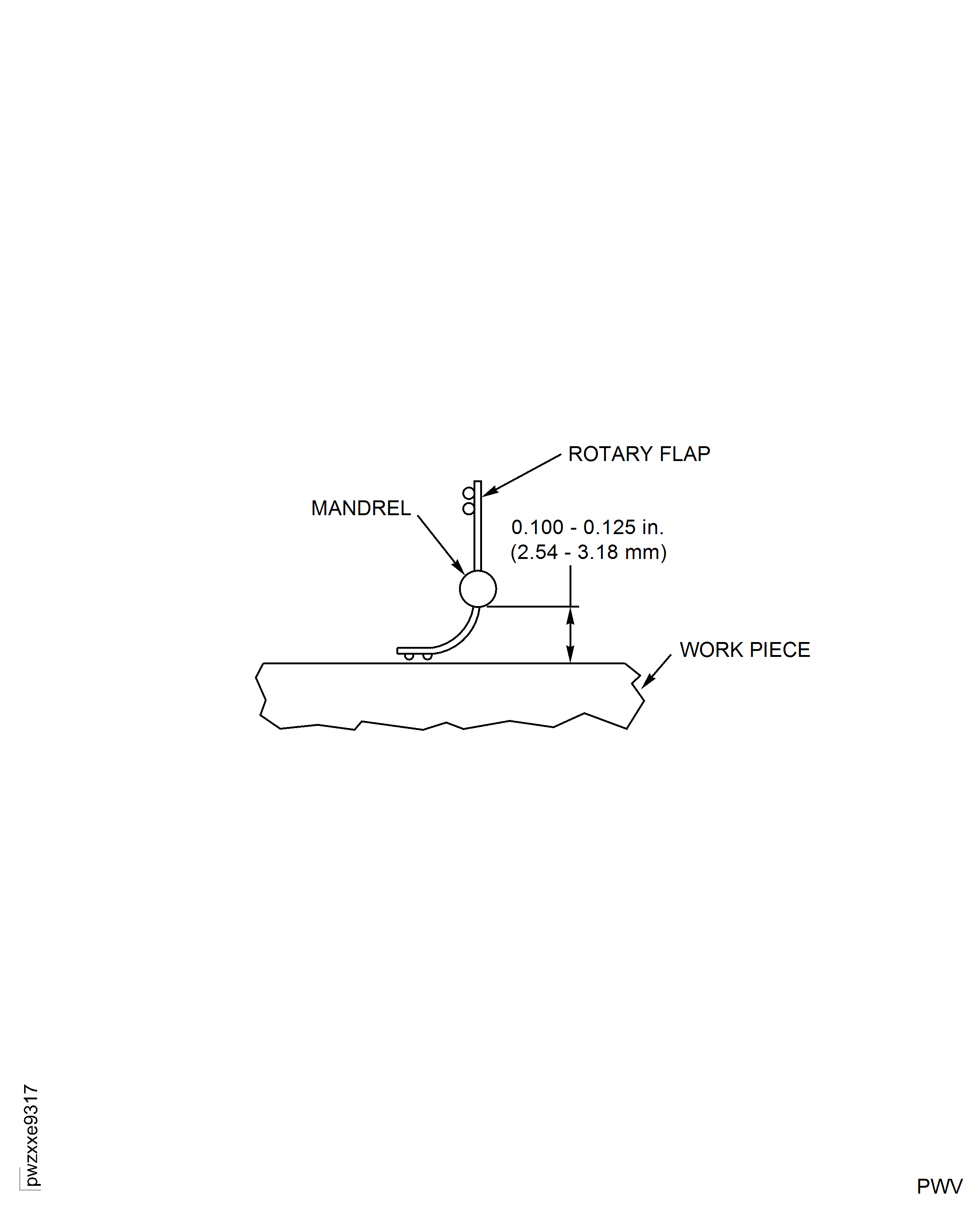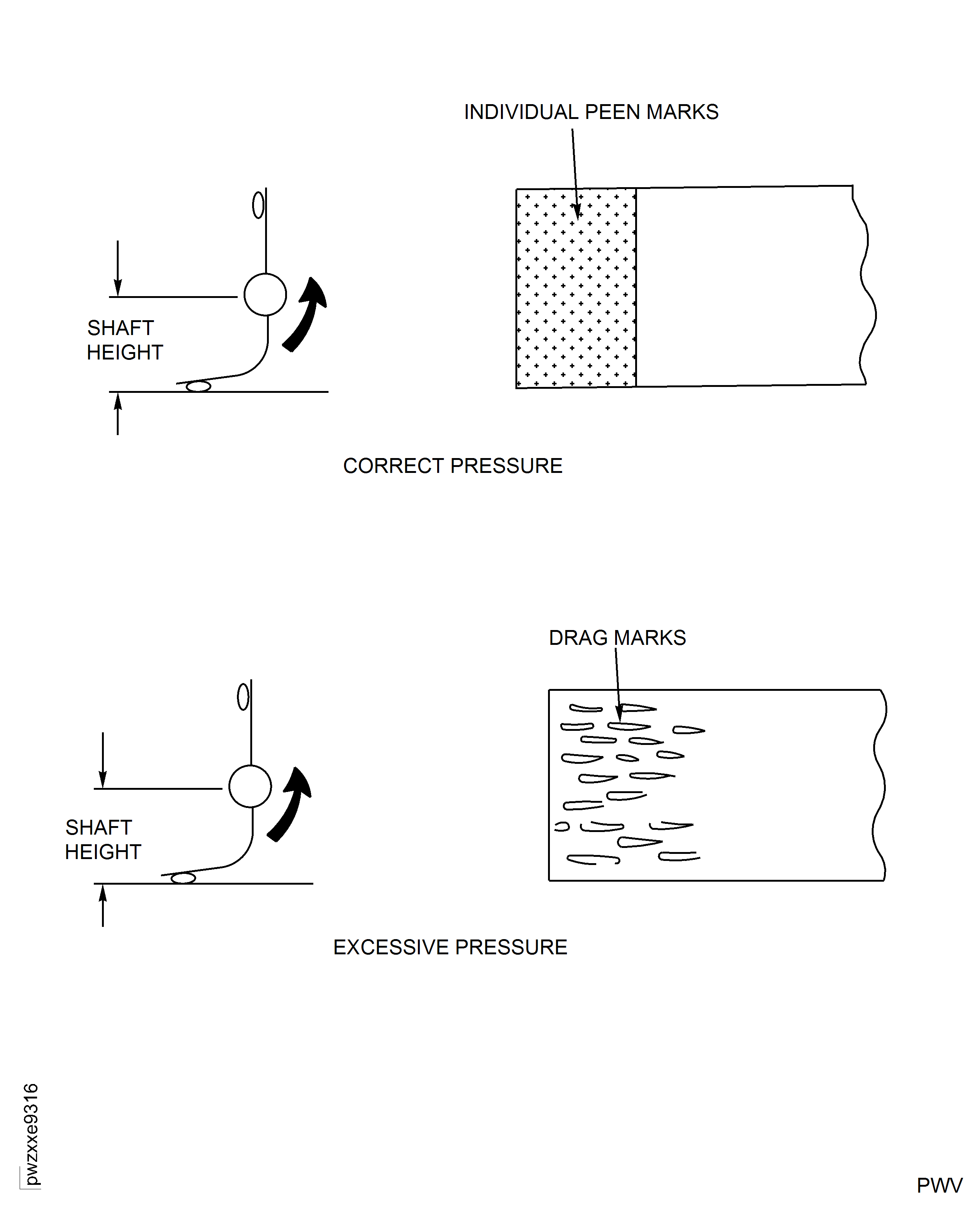 Set the speed of the flapper to create the correct pressure. Keep the correct pressure as indicated by individual peen marks. Too much pressure will cause the shot metal to drag, which will score the surface and will cause the wheel to break. See Figure.