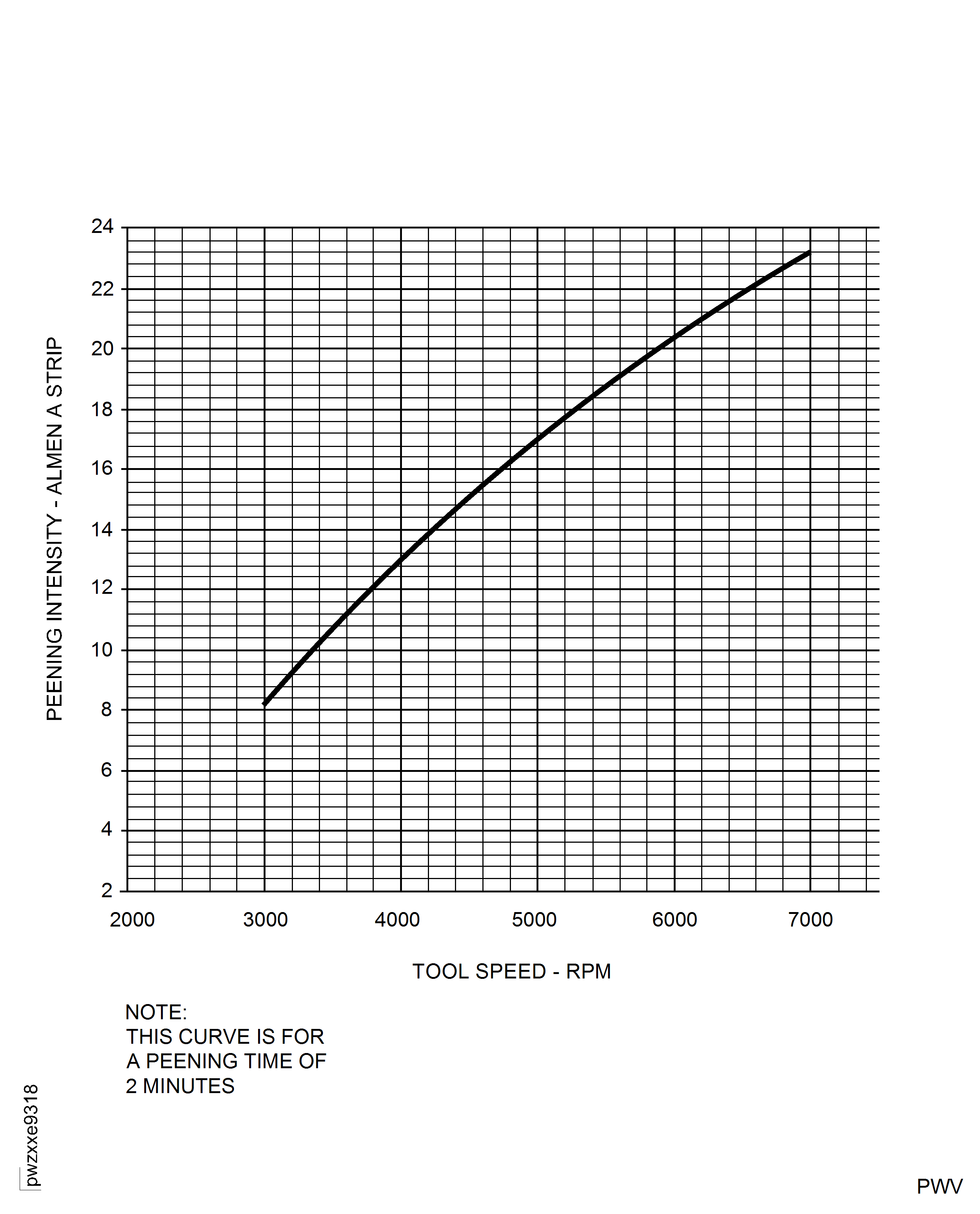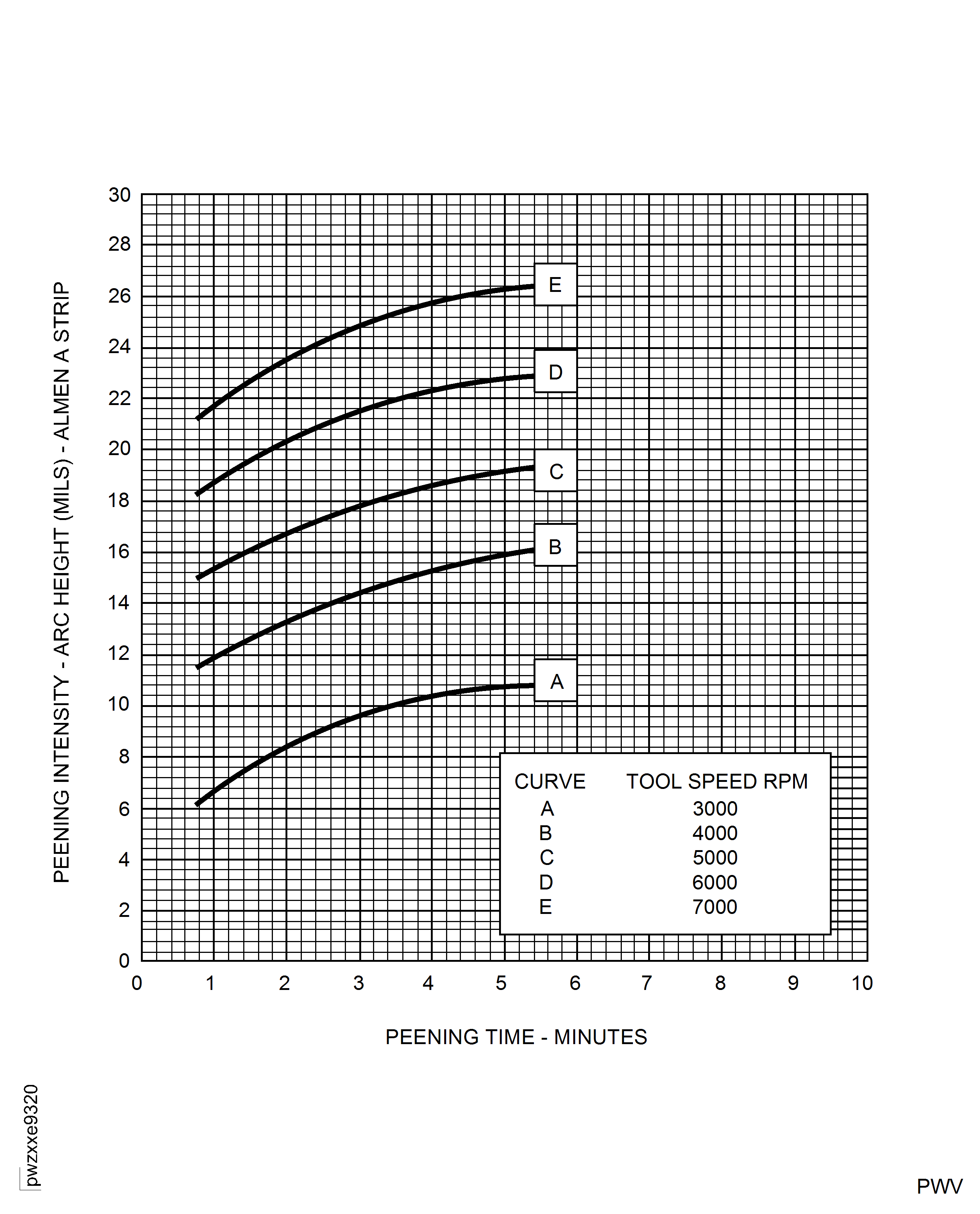Do a test with a different tool speed (increase the speed to increase the intensity or decrease the speed to decrease the intensity). The curves in Figure show peening time and intensities at different tool speeds. These curves are approximate because results can change when you use manually-controlled equipment.