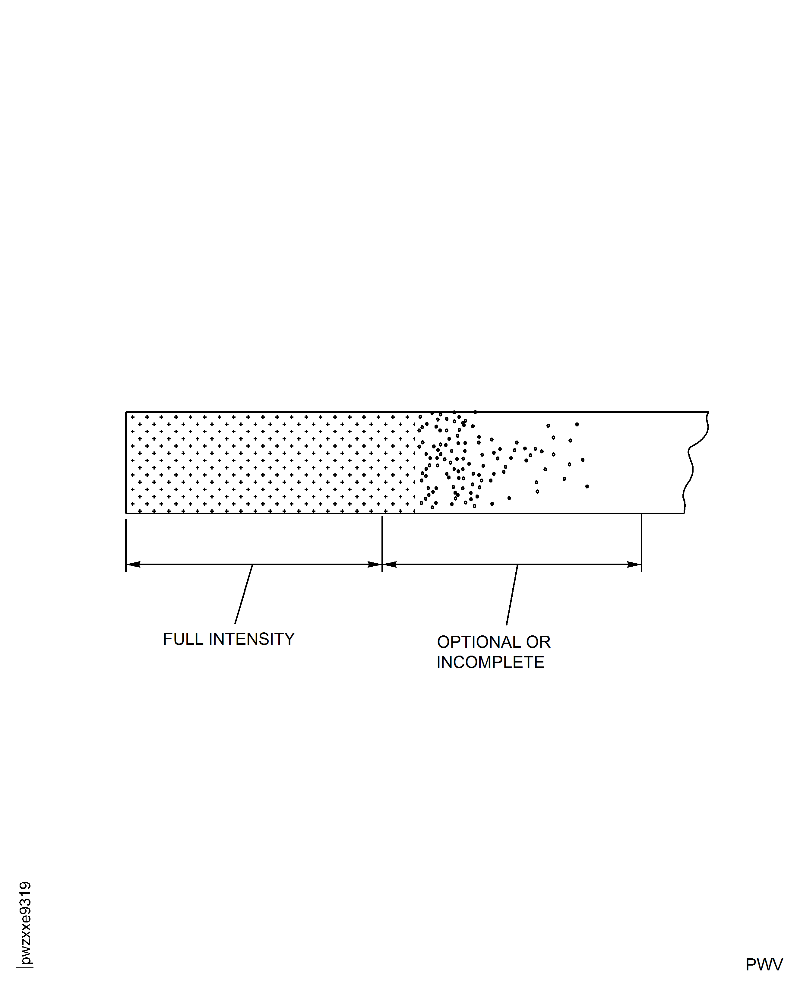 Prevent a sharp transition from full peening intensity to zero peening intensity. Zones in which peening is optional or zones in which peening is not required to be complete, should exhibit a decreasing density of marks from full peening intensity to zero peening intensity. See Figure.