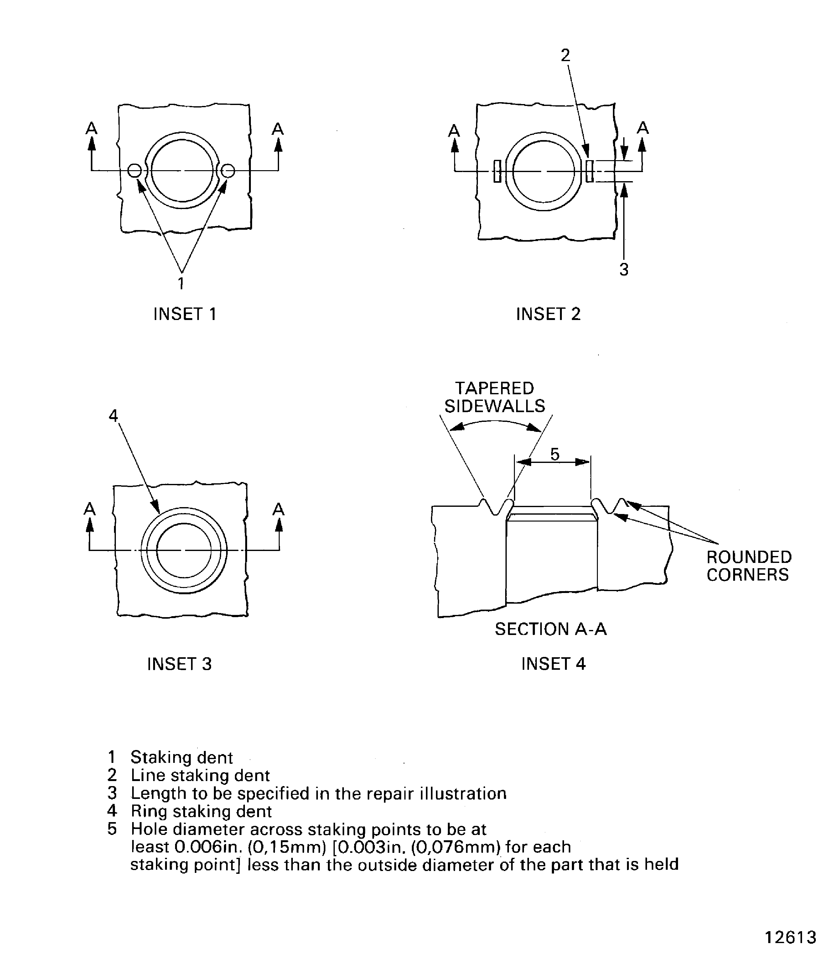 The hole diameter at each staking position is at least 0.003 in. (0.076 mm) less than the outside diameter of the part held. (Figure INSET 4).