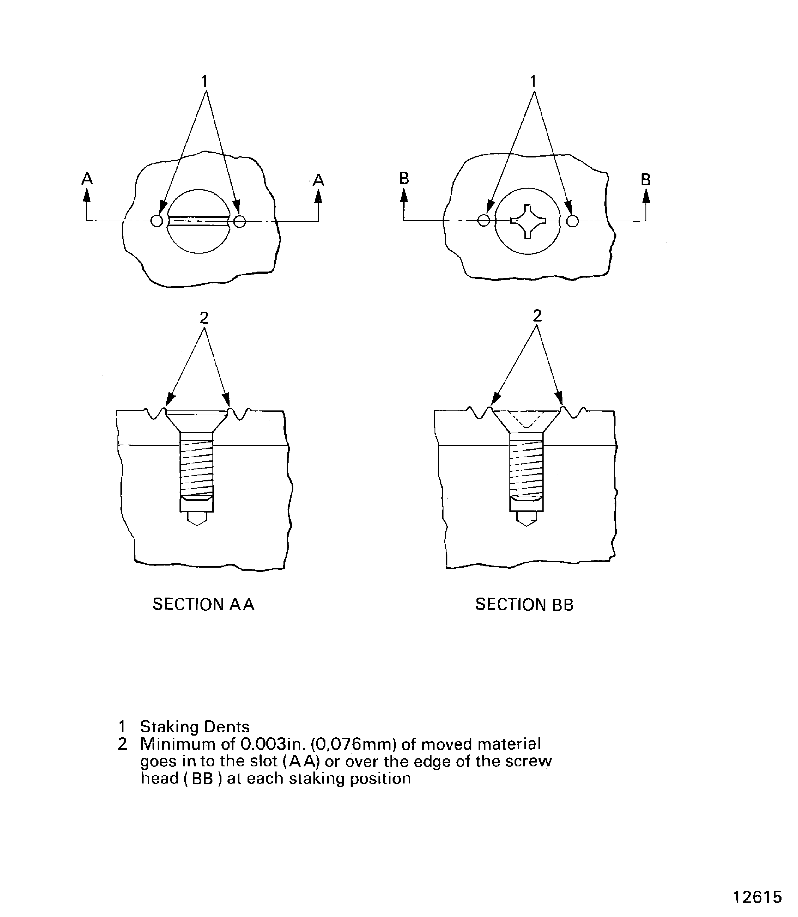 The staking dents must be on the edge of the screw head and equally divided to the nearest 15 degrees. The material moved by the staking dent must be over the edge of the screw head.
