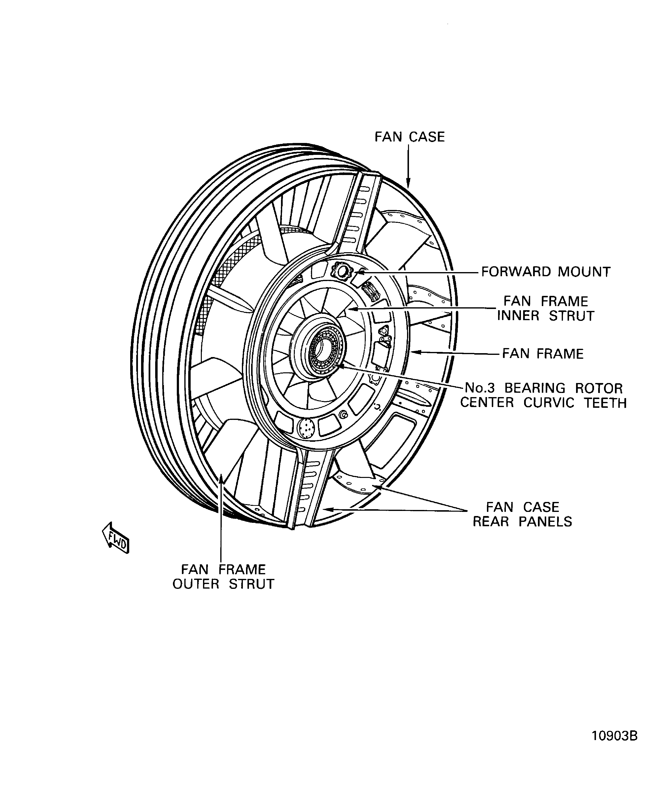 The case module includes a front bearing compartment where No.1, No.2 and No.3 bearing are installed. The fan/LPC rotor is held in position by the No.1 and No.2 bearings. The No.3 bearing holds the front part of the HP compressor (HPC) rotor from which the power is supplied to the Power Take Off (PTO) system. These rotors and the bearing compartment are held by an intermediate structure of the case module.