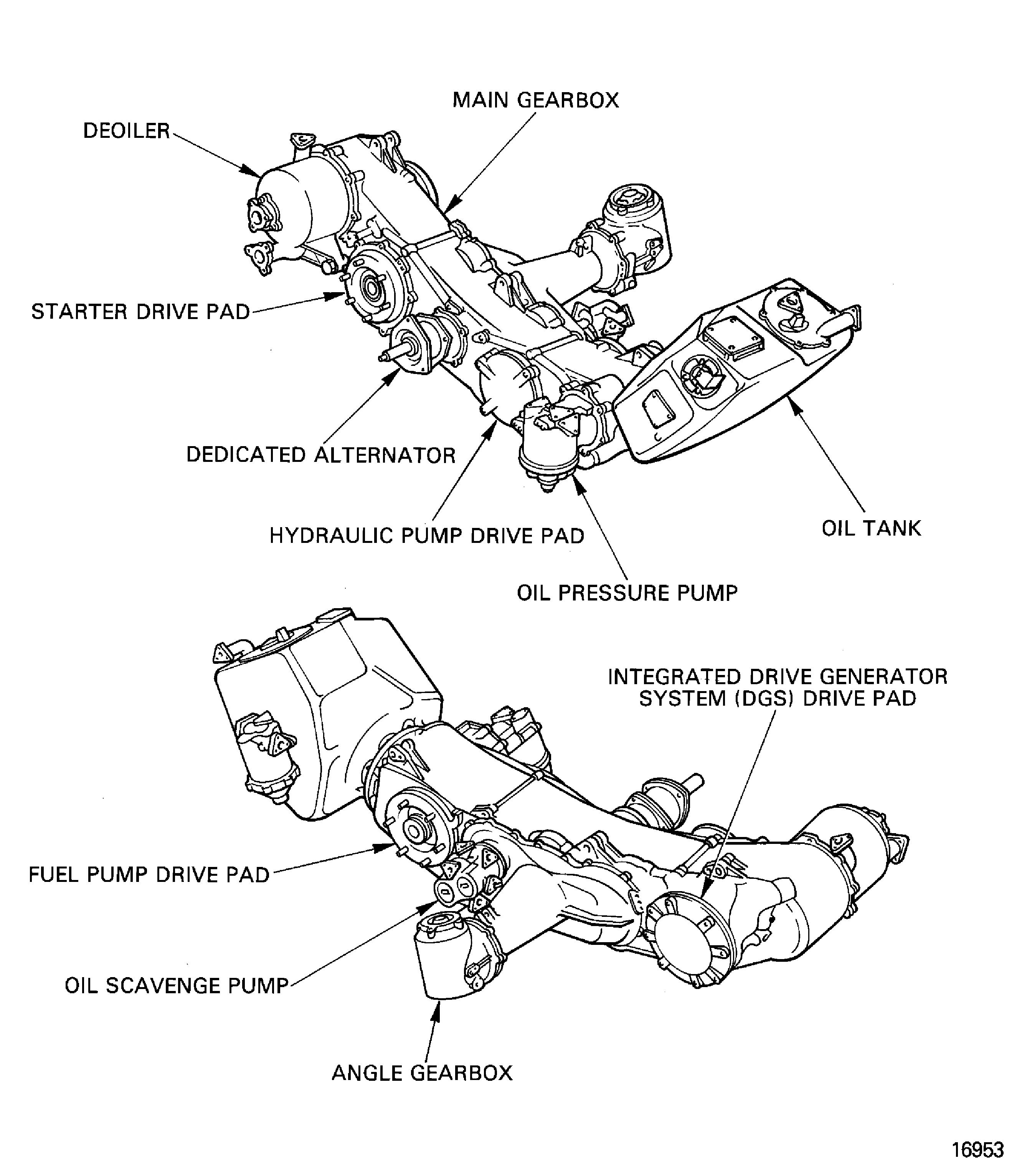 The main gearbox is installed forward of the angle gearbox. It is attached to the angle gearbox by an angle gearbox support and to the intermediate case flange by three joint links.