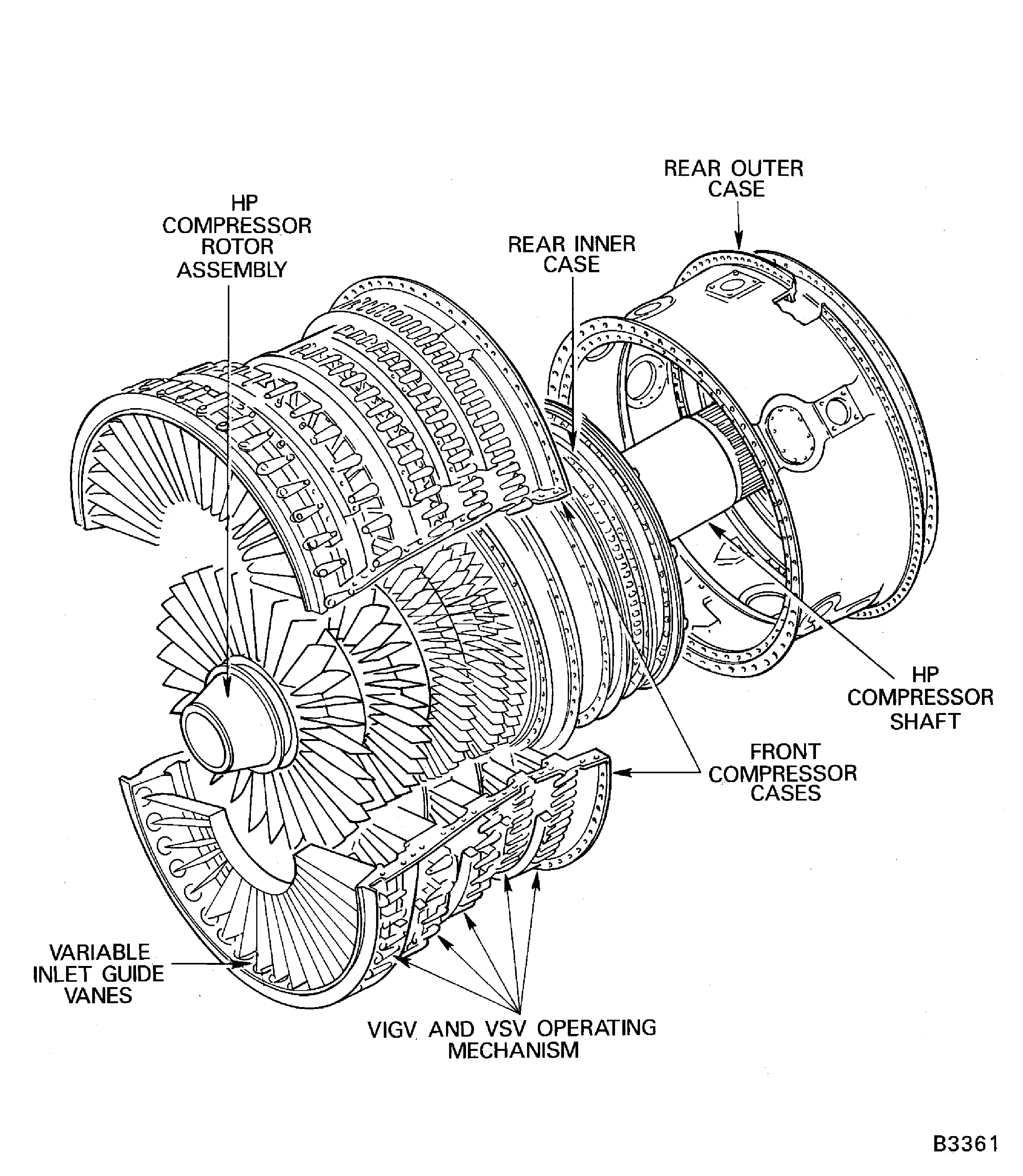 The HPC assembly is a 10 stage axial flow compressor. It has a rotor assembly and stator cases. As the compressor stages are numbered from the front of the engine, the first stage of the HPC is stage 3.