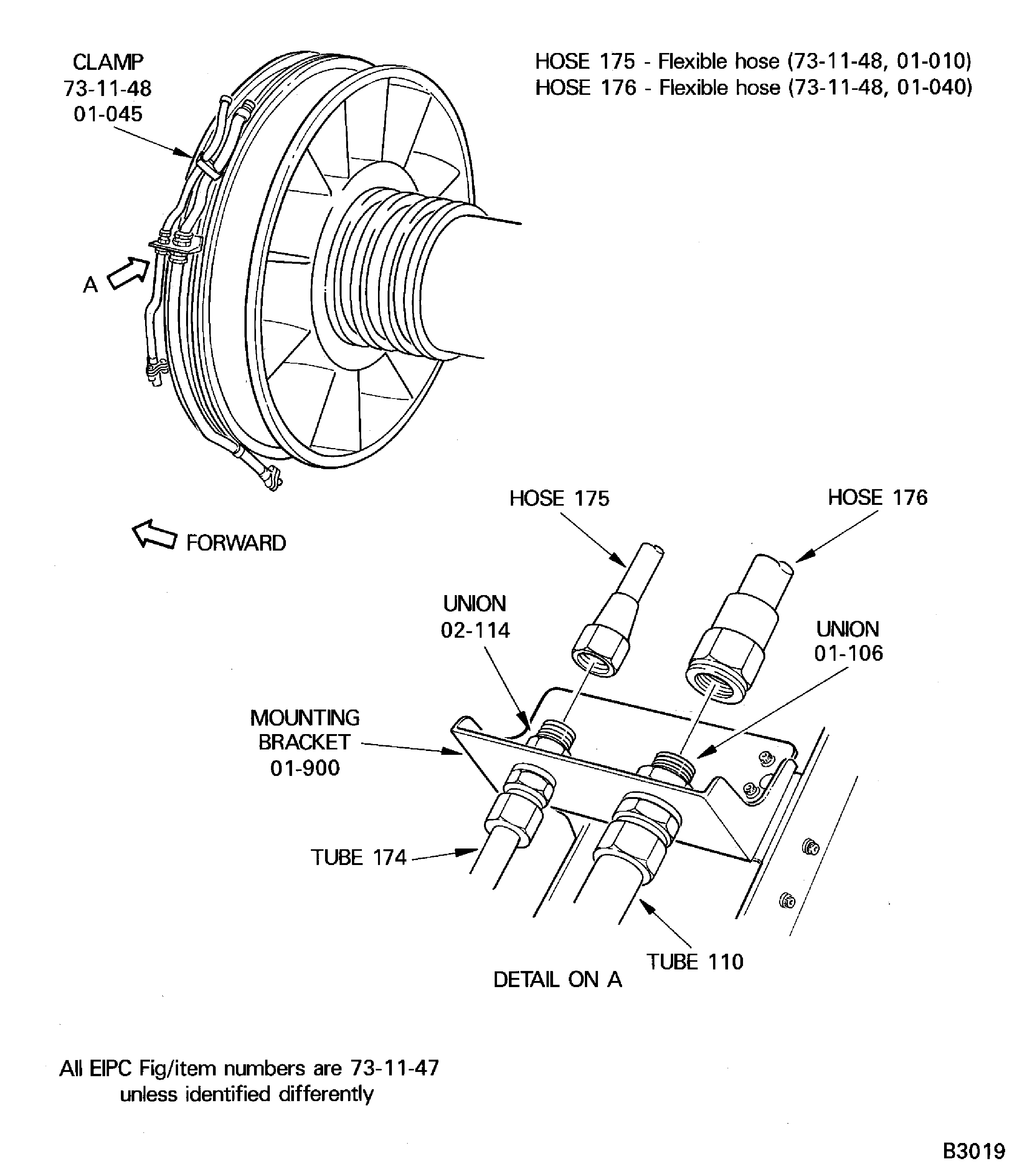 Connect the hose 175 to the union FUEL SYSTEM TUBES (RIGID)-POWER PLANT (73-11-47, 02-114) and torque to 470 to 510* lbf.in (53 to 58 Nm).