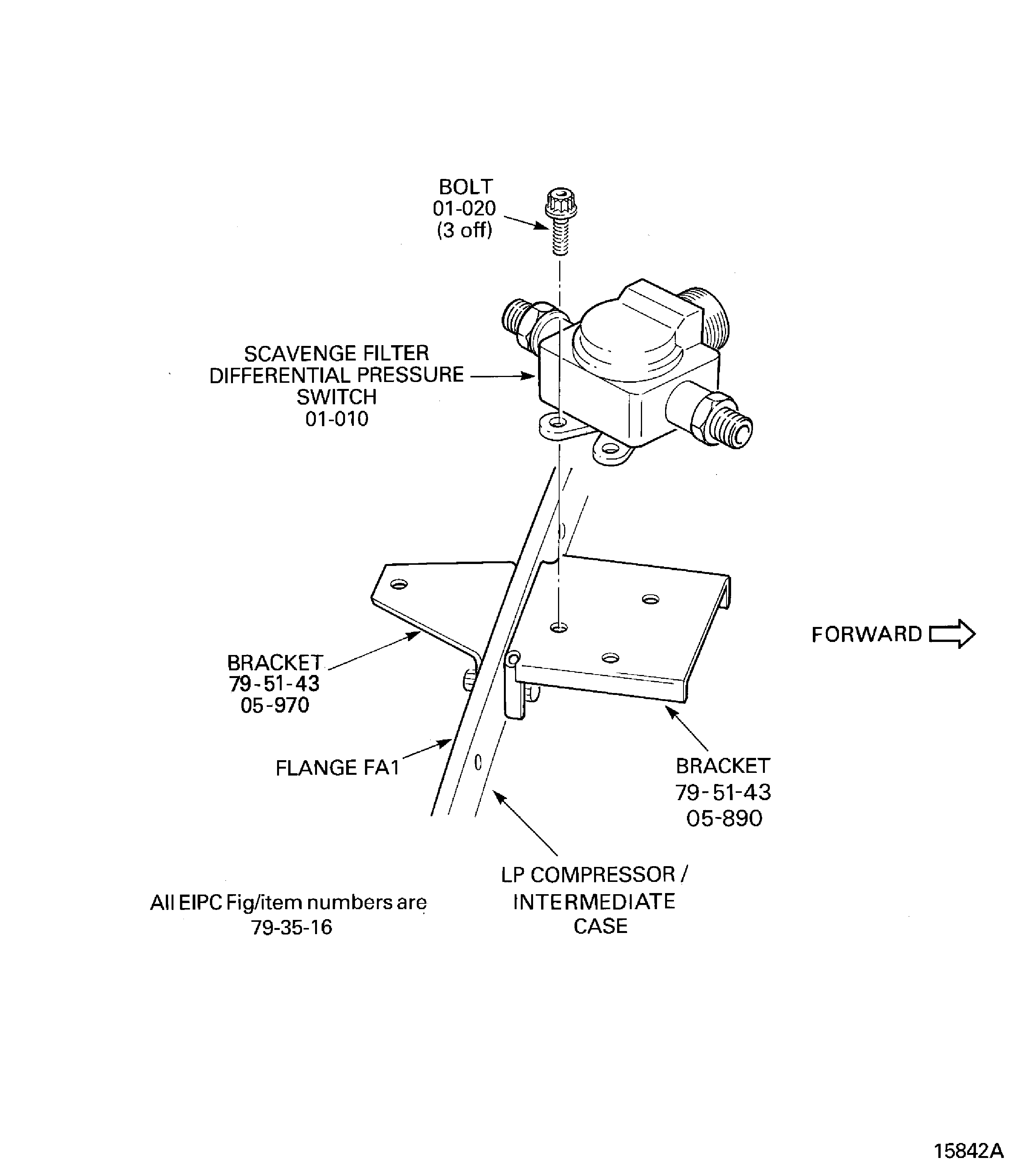 The low oil pressure switch must have its maintenance completed, as given in the Eaton/Consolidated Controls Component Maintenance Manual (79-34-15).Remove the three bolts that attach the pressure switch to the mounting bracket General Services Harness (71-51-43, 05-990) between flanges FA1 and FB. Remove the switch.
