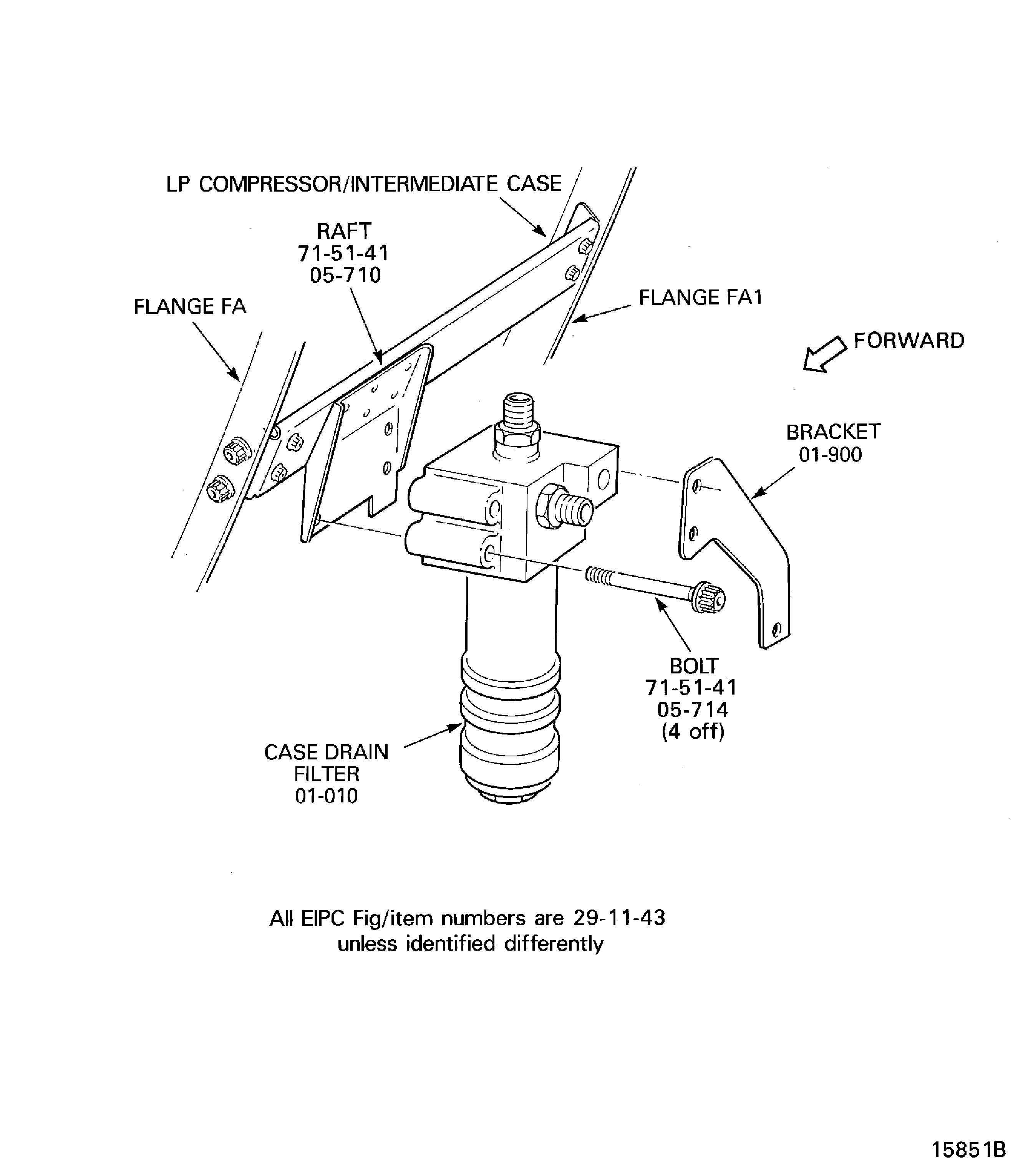 The case drain filter assembly must have its maintenance completed, as given in the Pall Filtrationstechnik Component Maintenance Manual (29-11-43).Remove the four bolts that attach the case drain filter to the raft CASE DRAIN HYDRAULIC FILTER ASSEMBLY (29-11-43, 01-910). Remove the case drain filter (together with the bracket CASE DRAIN HYDRAULIC FILTER ASSEMBLY (29-11-43, 01-900).