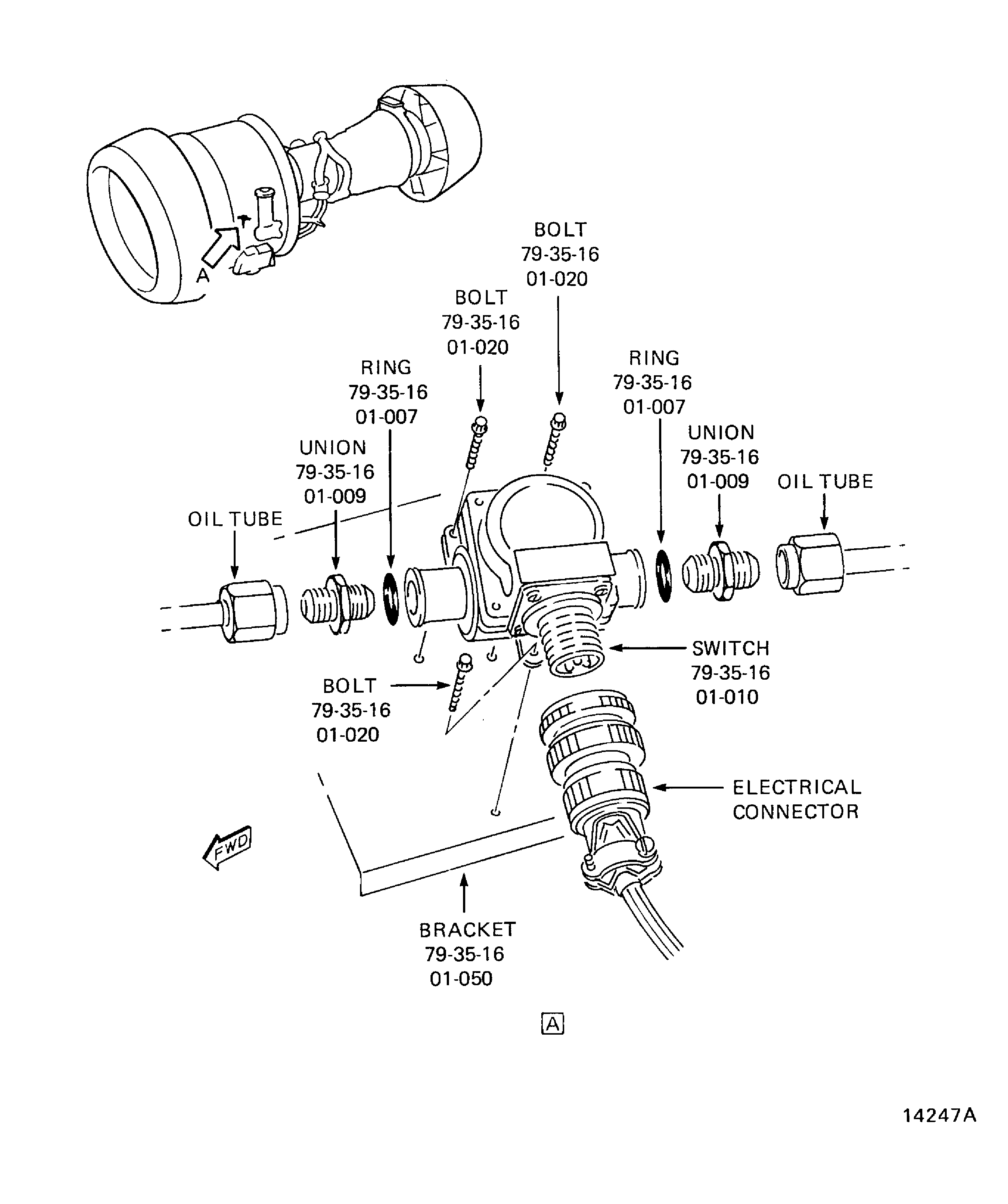 Hold the SFDP OIL-SCAVENGE FILTER DIFFERENTIAL PRESSURE SWITCH (79-35-16, 01-010) and remove the three bolts OIL-SCAVENGE FILTER DIFFERENTIAL PRESSURE SWITCH (79-35-16, 01-020). Remove the SFDP OIL-SCAVENGE FILTER DIFFERENTIAL PRESSURE SWITCH (79-35-16, 01-010) from the engine.