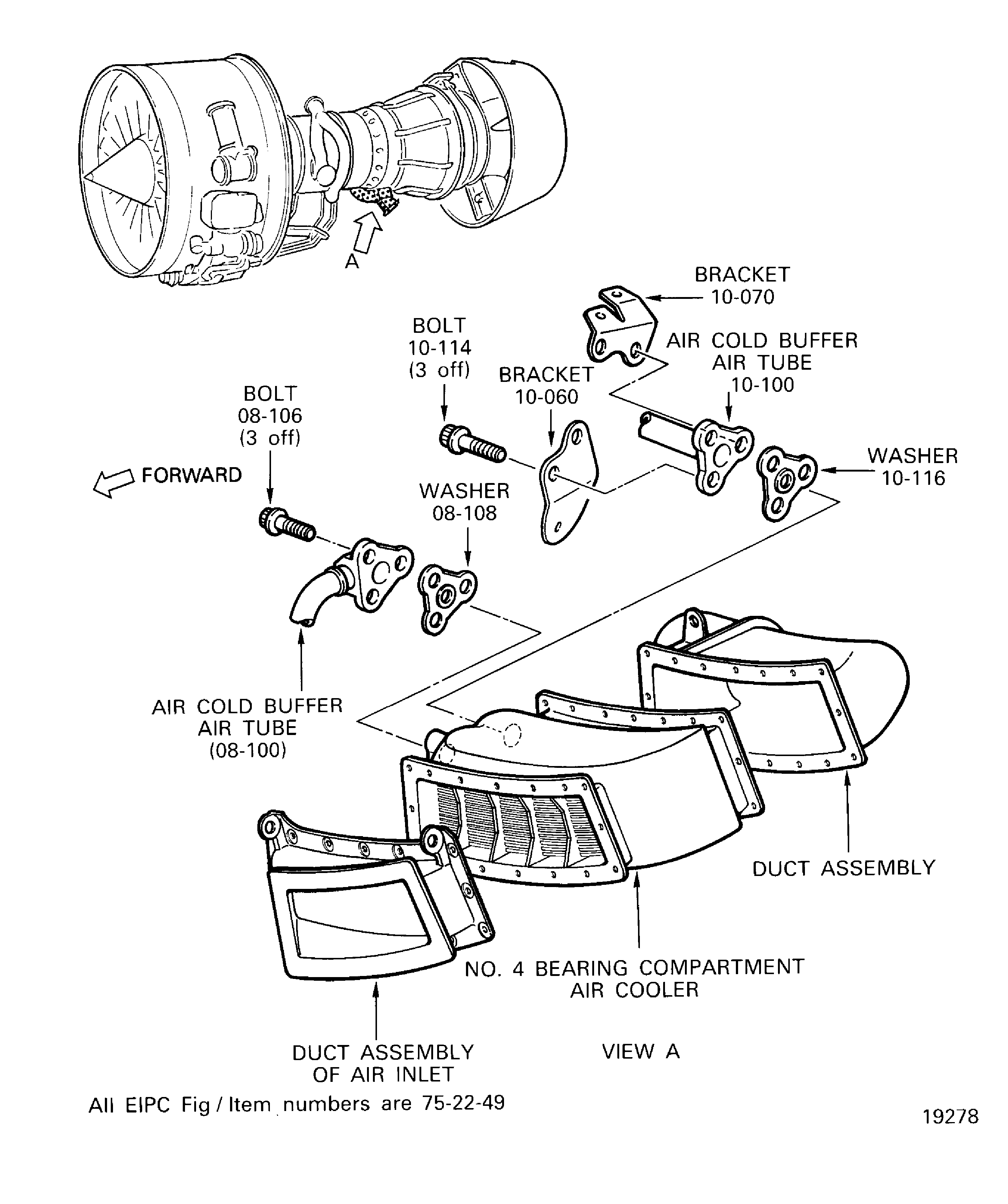 Remove three bolts Bearing Compartment Cooling And Sealing Air Tubes (75-22-49, 08-106) from the air tube Bearing Compartment Cooling And Sealing Air Tubes (75-22-49, 08-100) and remove the washer Bearing Compartment Cooling And Sealing Air Tubes (75-22-49, 08-108). Discard the washer.