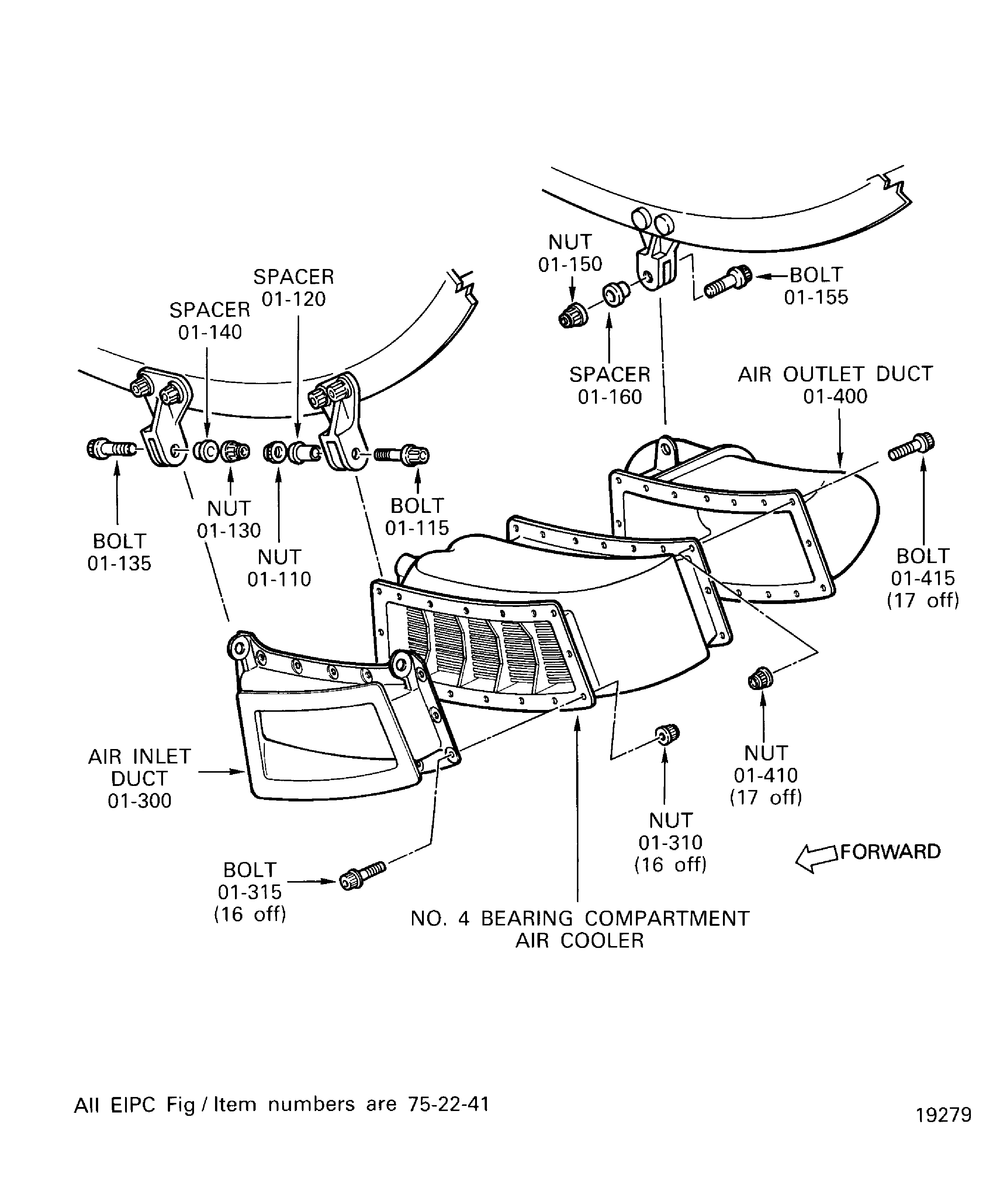 Remove the bolts No. 4 Bearing Compartment Cooler Air Ducts (75-22-41, 01-115), No. 4 Bearing Compartment Cooler Air Ducts (75-22-41, 01-135) and No. 4 Bearing Compartment Cooler Air Ducts (75-22-41, 01-155) and the spacers No. 4 Bearing Compartment Cooler Air Ducts (75-22-41, 01-120), No. 4 Bearing Compartment Cooler Air Ducts (75-22-41, 01-140) and No. 4 Bearing Compartment Cooler Air Ducts (75-22-41, 01-160).