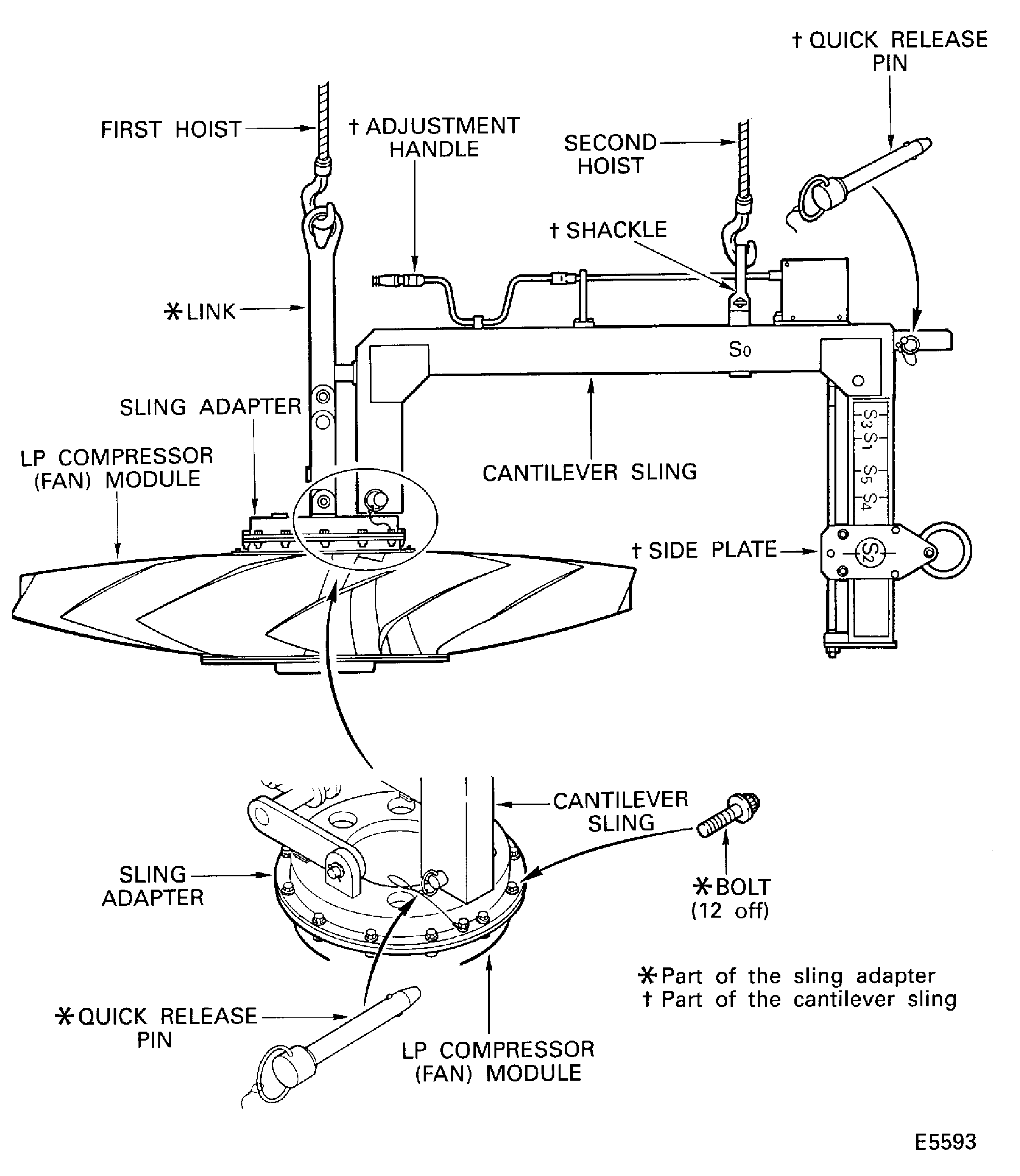 Install IAE 1J12104 Sling adapter 1 off on to the LP Compressor (fan) module.