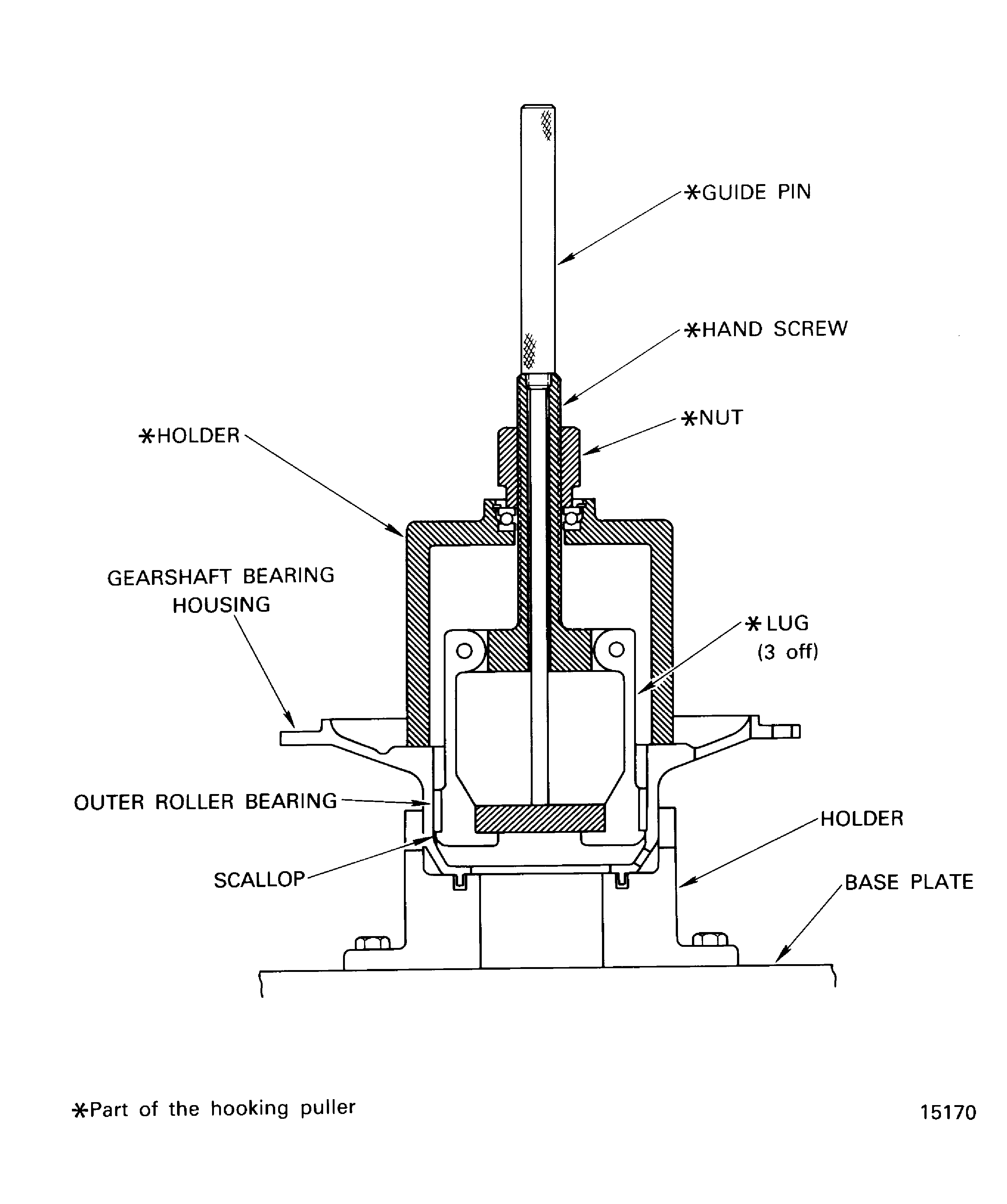 Remove the outer roller bearing from the gearshaft bearing housing with IAE 1J12348 Hooking puller 1 off.