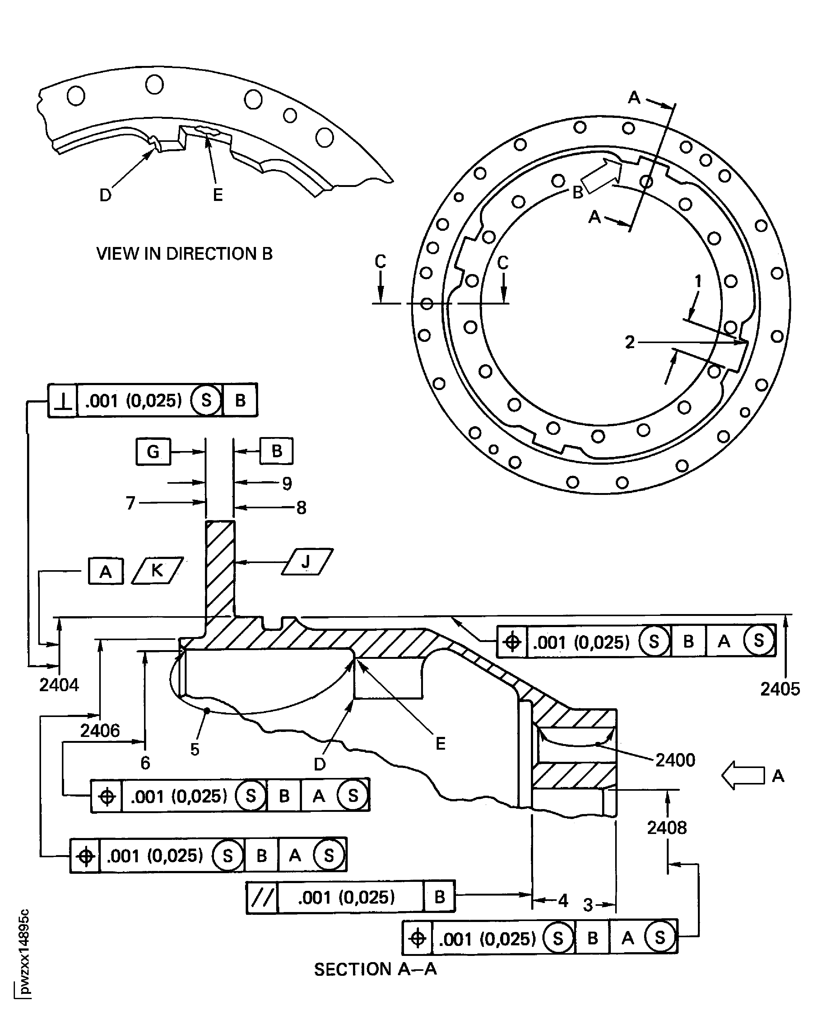 If the measured diameter in a free condition is not satisfactory, a held condition is permitted. All dimensions apply when Surface J is flat by 0.001 in. (0.025 mm) and Diameter K maintains a clearance envelope of 11.345 in. (0.025 mm) and Diameter K maintains a clearance envelope of 11.345 in. (288.163 mm) in a free or held condition. Hold the spacer only on Surfaces J, G and Diameter K.Other than Step(a)