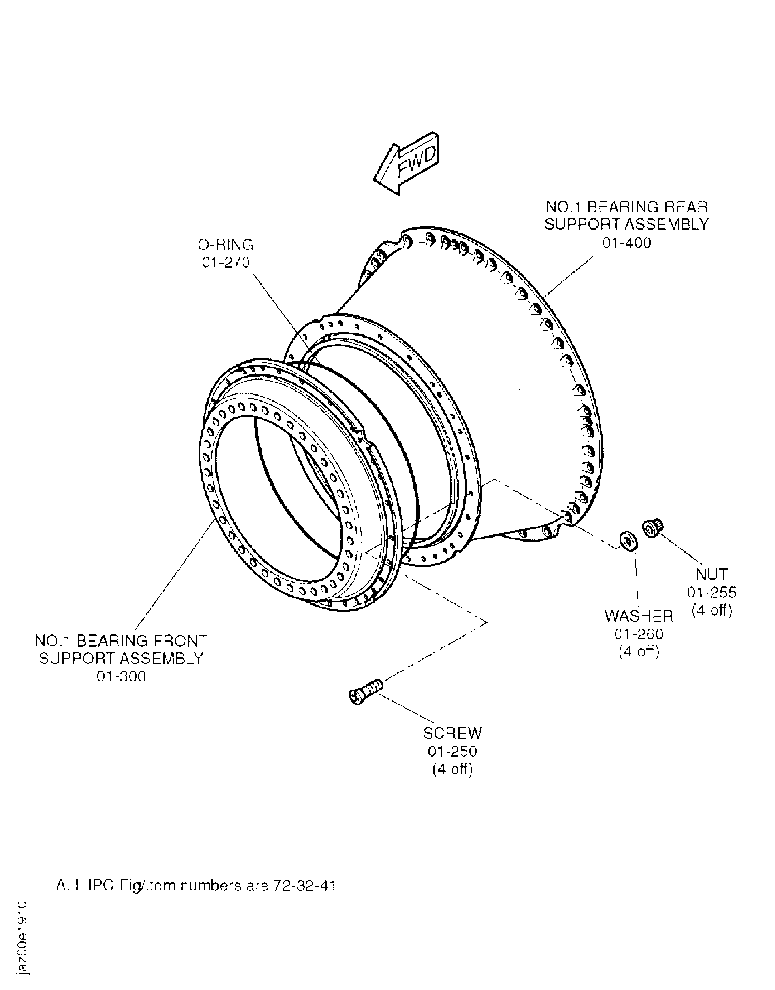 Use the four puller bolts (part of IAE 1J12188 Puller bolt 1 off) to release the No. 1 bearing front support assembly (01-300) from the No. 1 bearing rear support assembly (01-400).