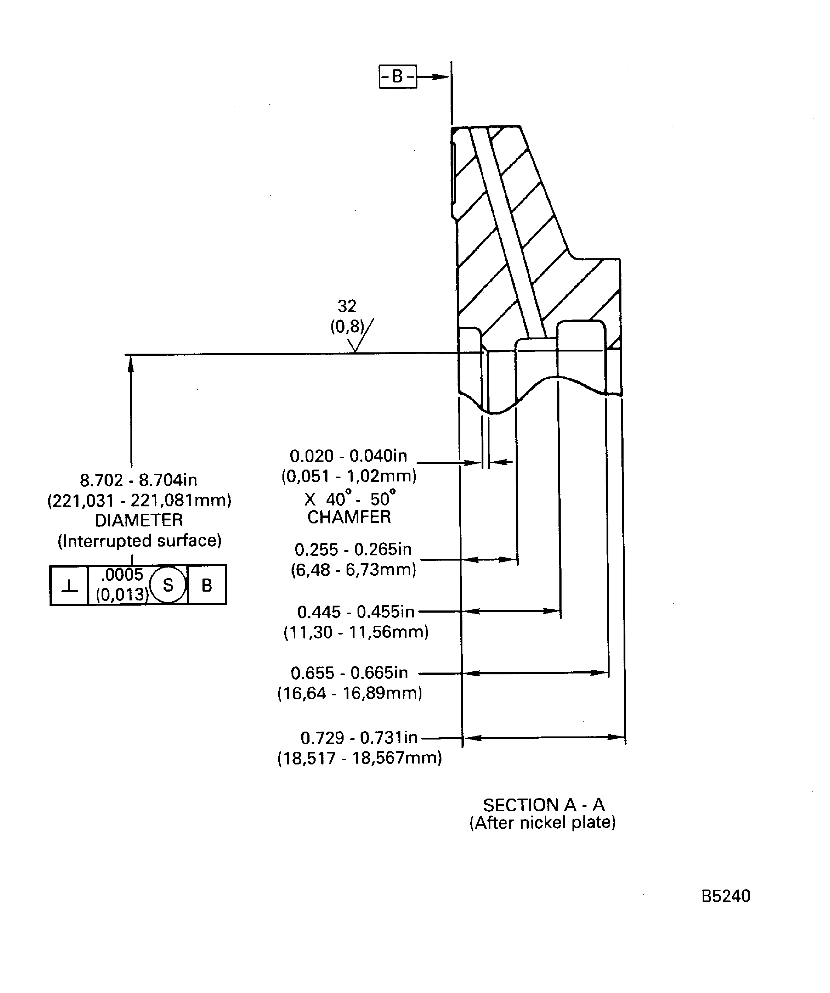 Machine the pilot diameter to 8.710 to 8.722 in. (221.23 to 221.54 mm).