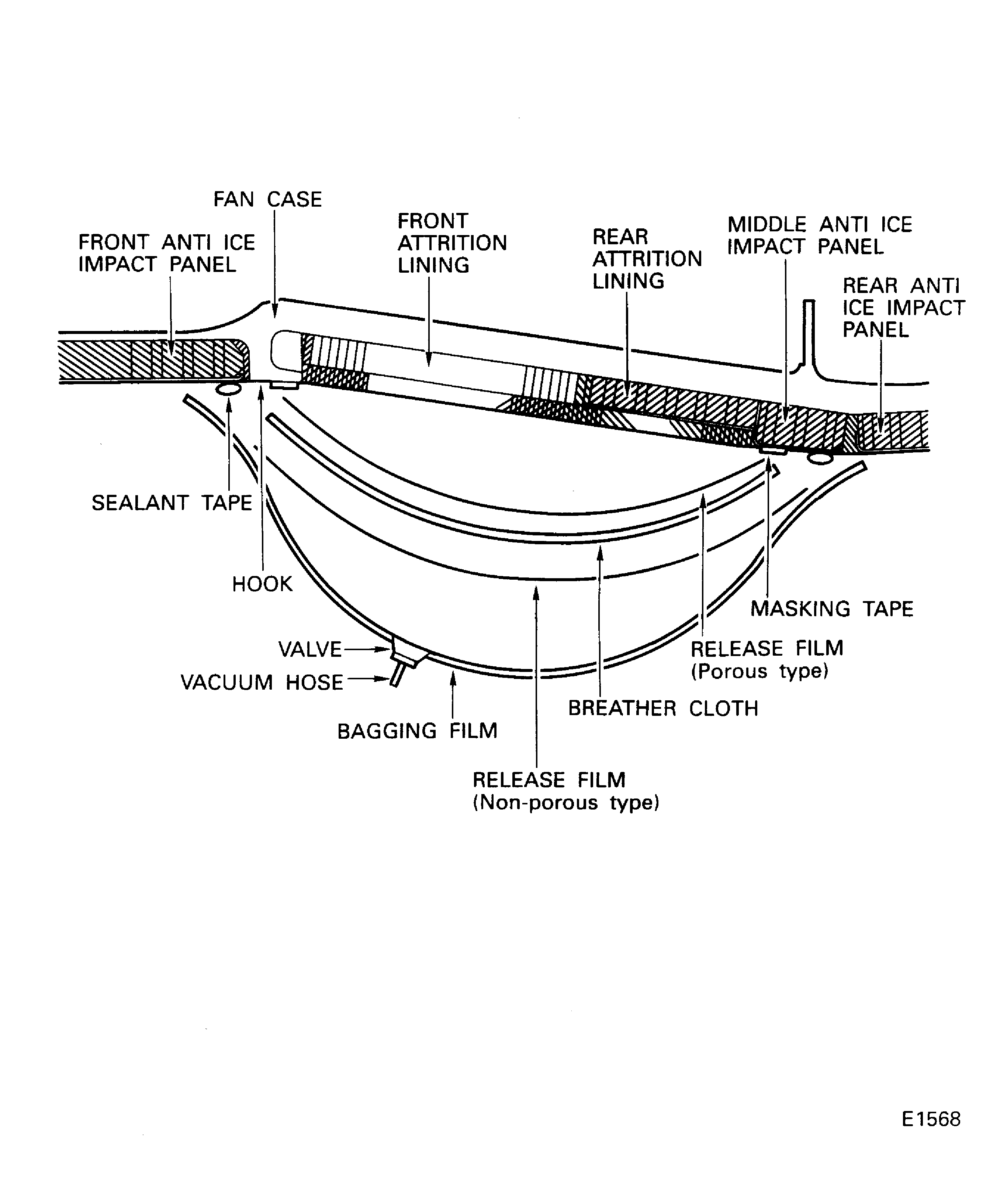 Seal the edges of the bagging film to the metal surface of the fan case and the anti-ice impact panels with CoMat 02-225 TAPE, VACUUM BAG SEALANT.