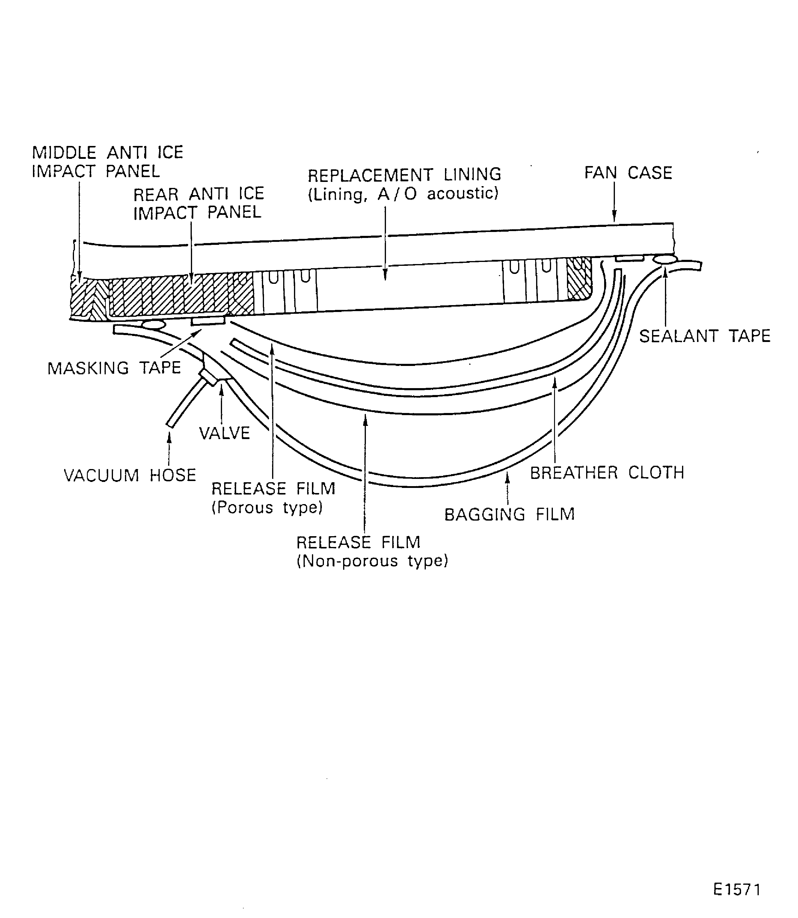 Over them spread a CoMat 02-222 BAGGING FILM between the area of the middle or the rear anti-ice impact panels and the metal surface of the fan case.