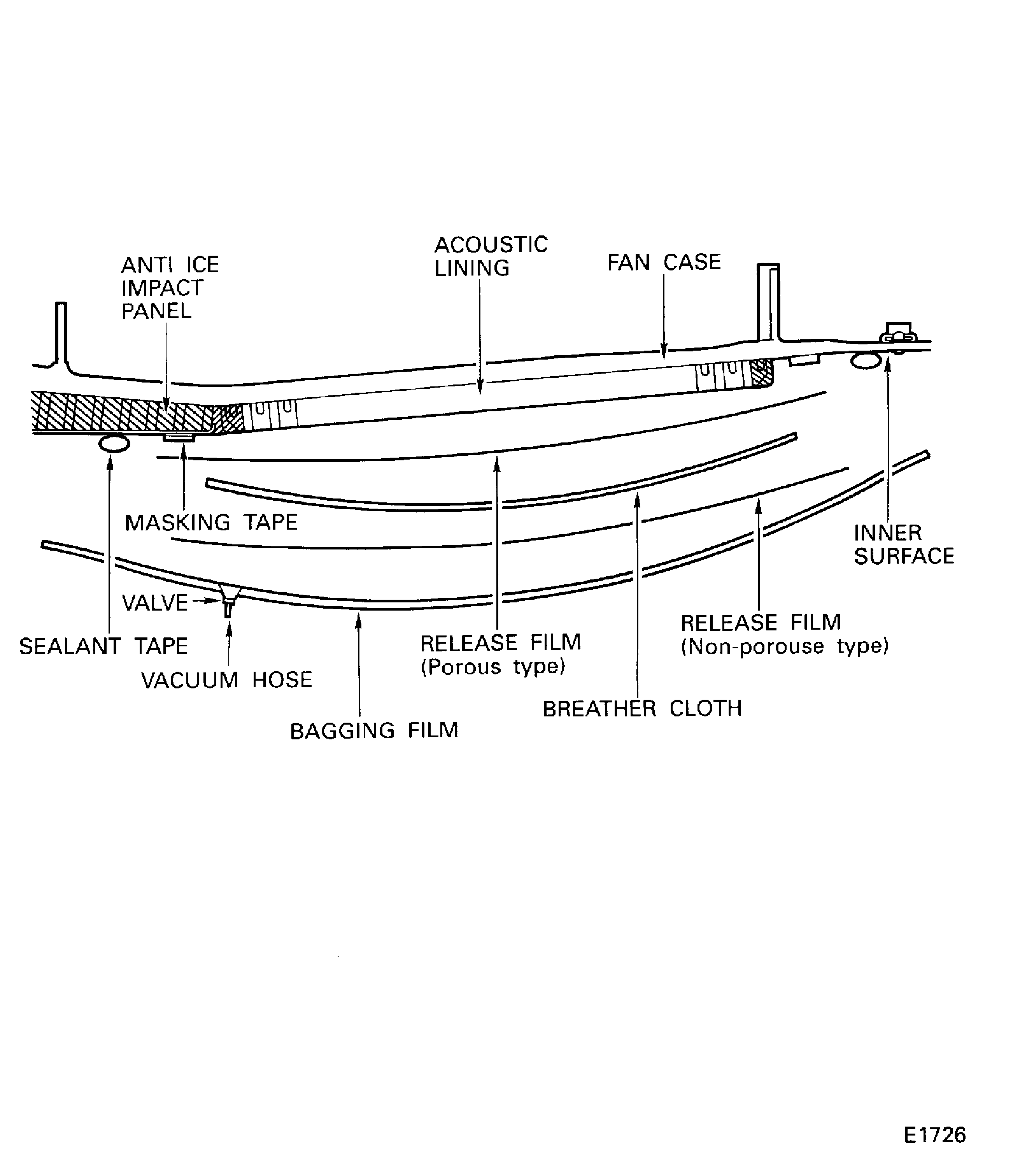 Over them spread a CoMat 02-222 BAGGING FILM between the area of the anti-ice impact panels and the metal surfaces of the fan case.