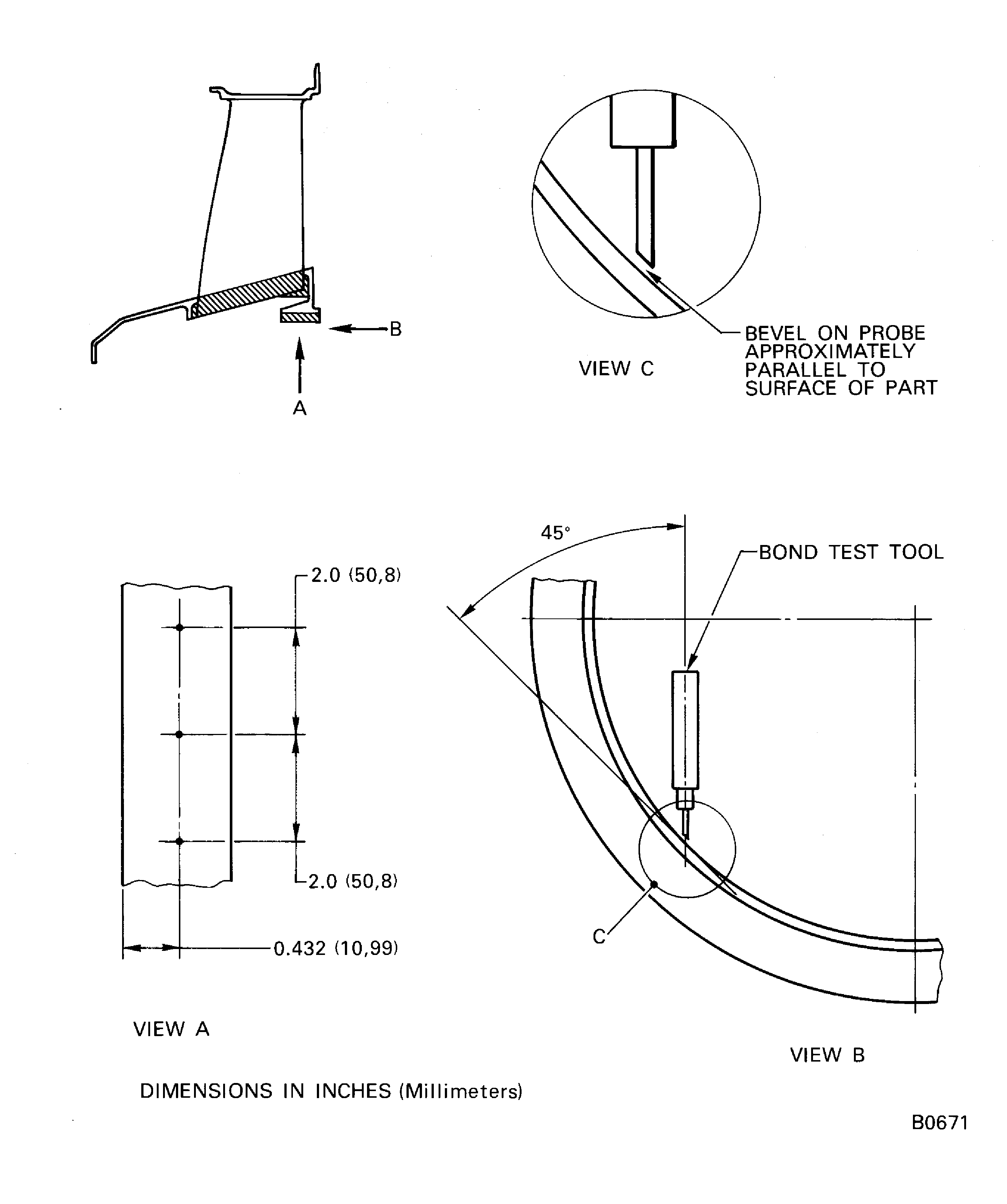 Probe angle: Approximately 45 degrees.Do a bond test to the repaired area.