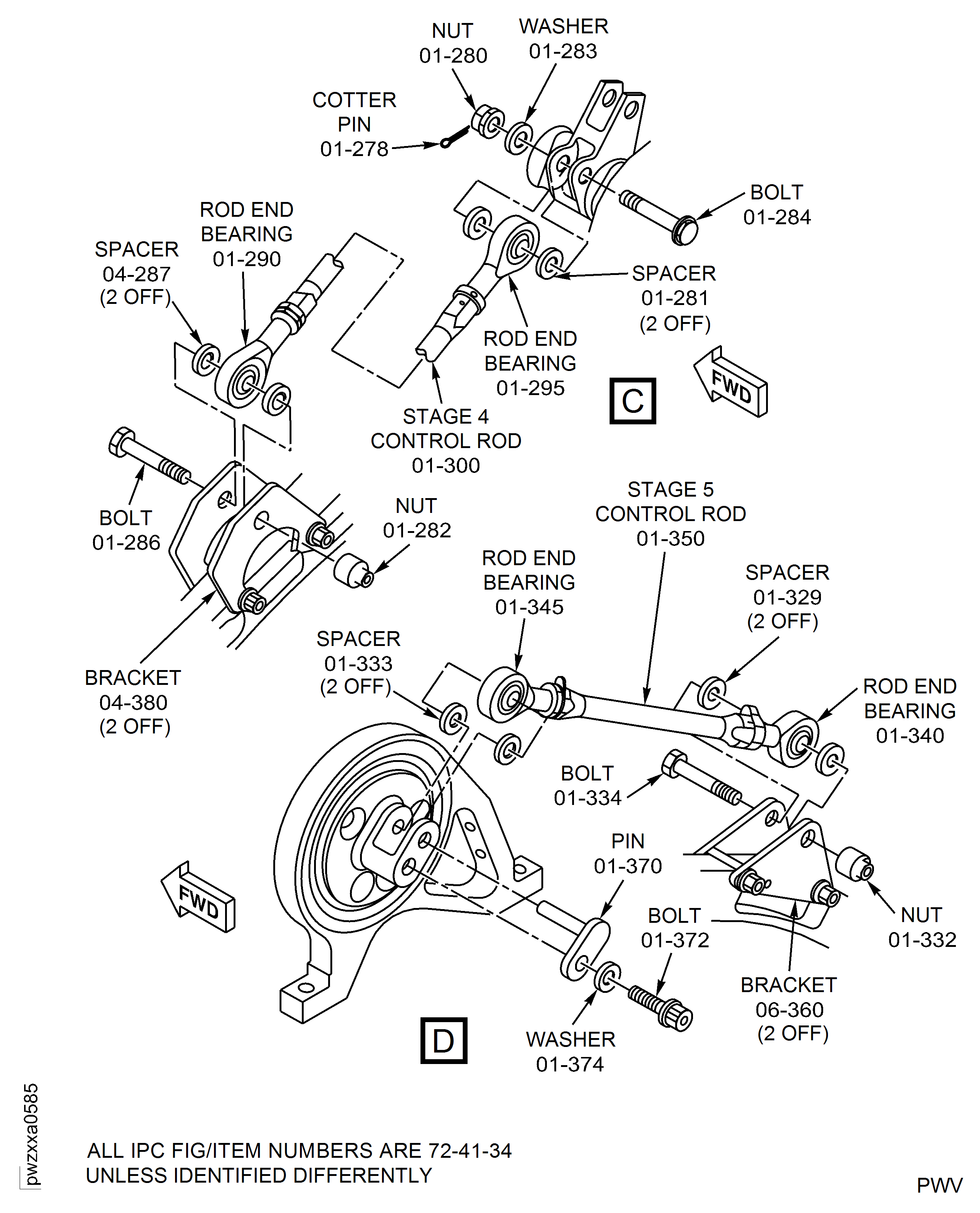 Remove the nut, two spacers and bolt which attach the control rod to the drive brackets on the lower stage 4 actuating ring.