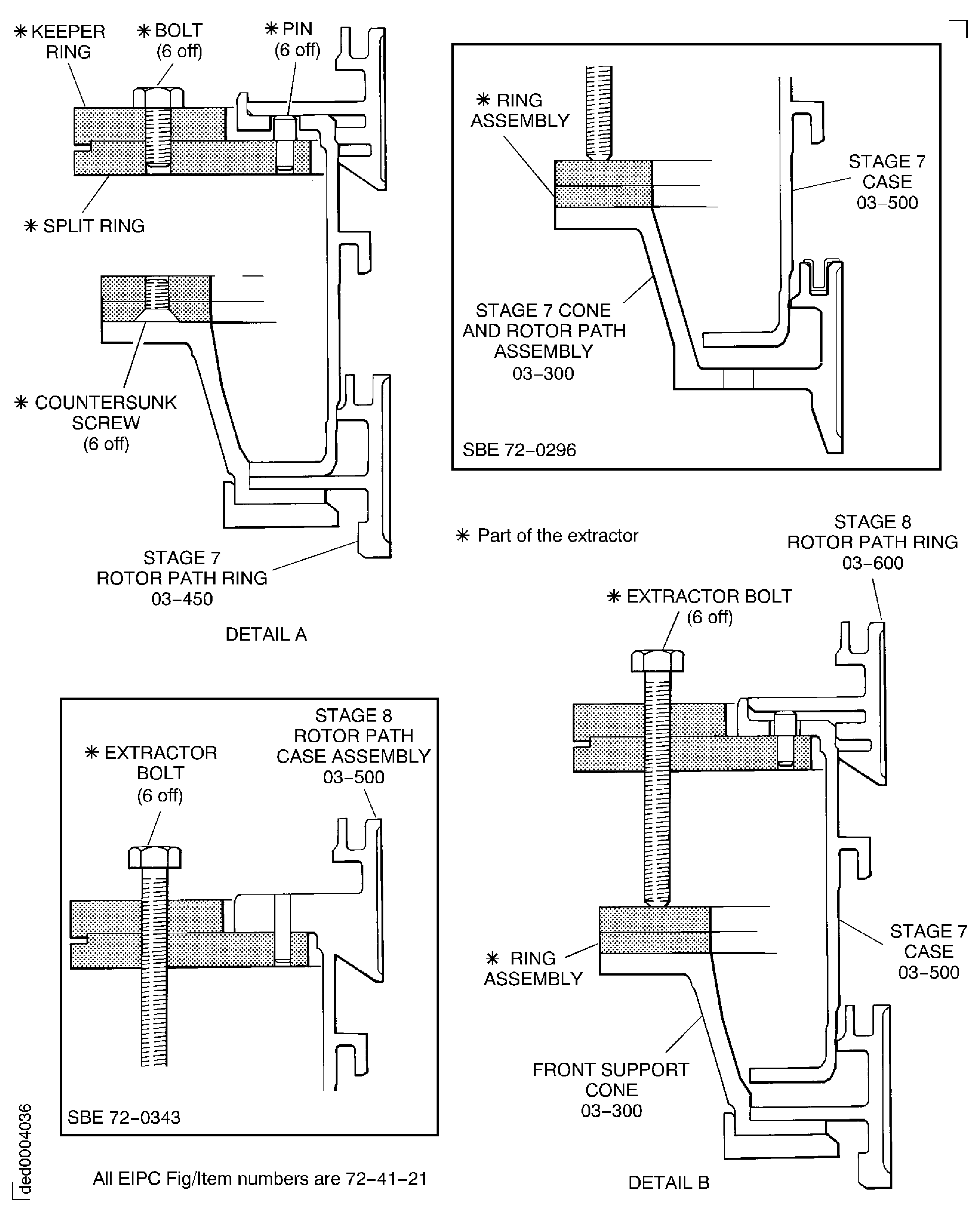 Figure: SBE 72-0280, Pre SBE 72-0296, SBE 72-0296, Pre SBE 72-0343 and SBE 72-0343: Remove the Stage 8 Case, Rotor Path Ring, Stator Vanes and the Stage 7 Case