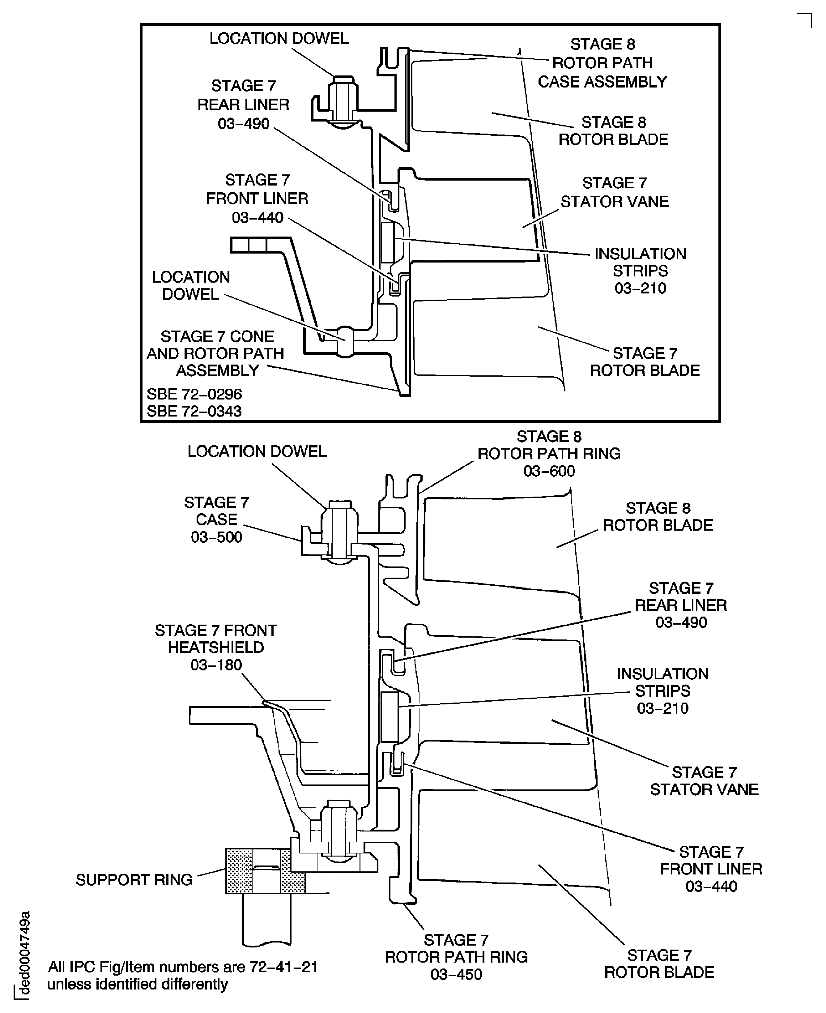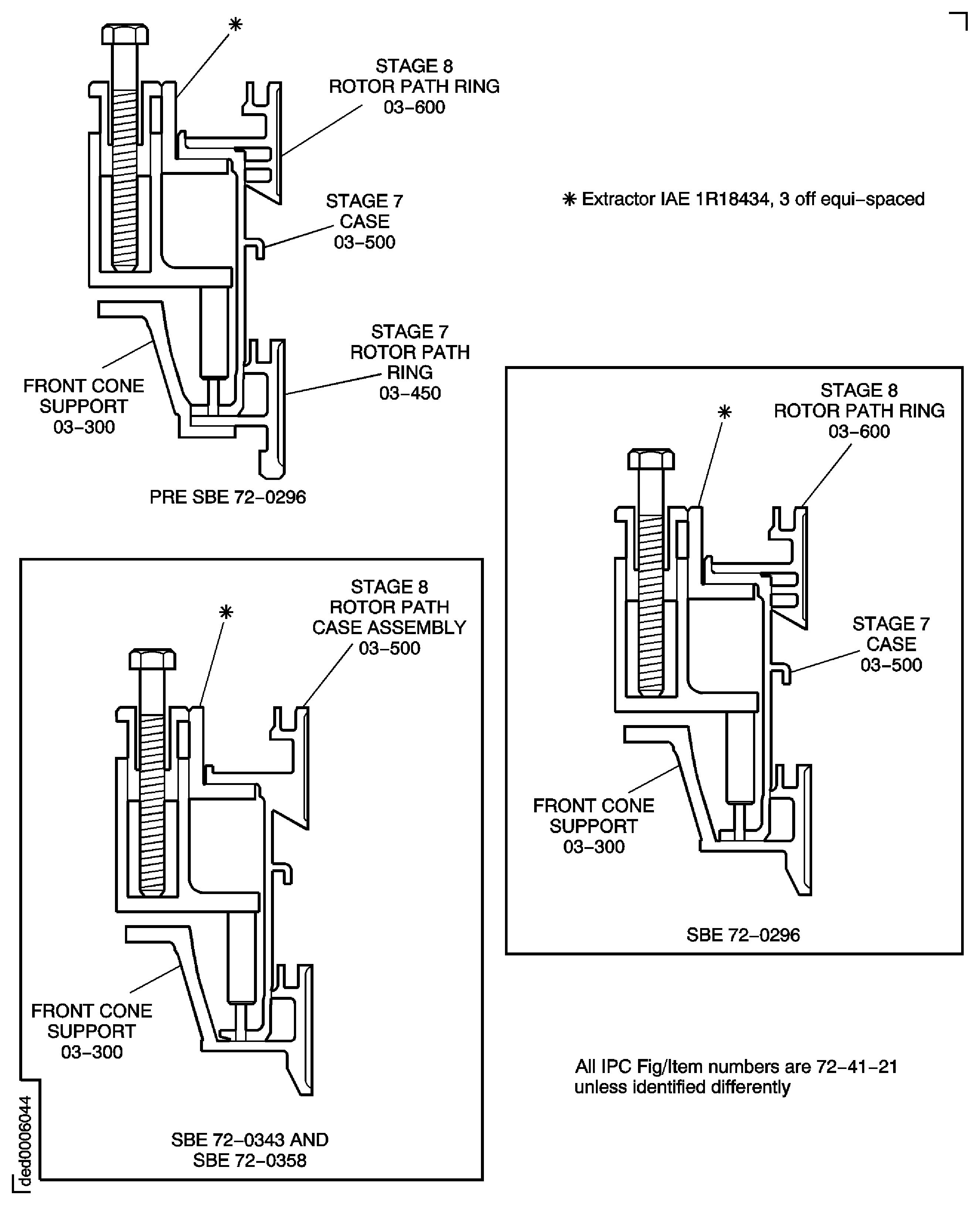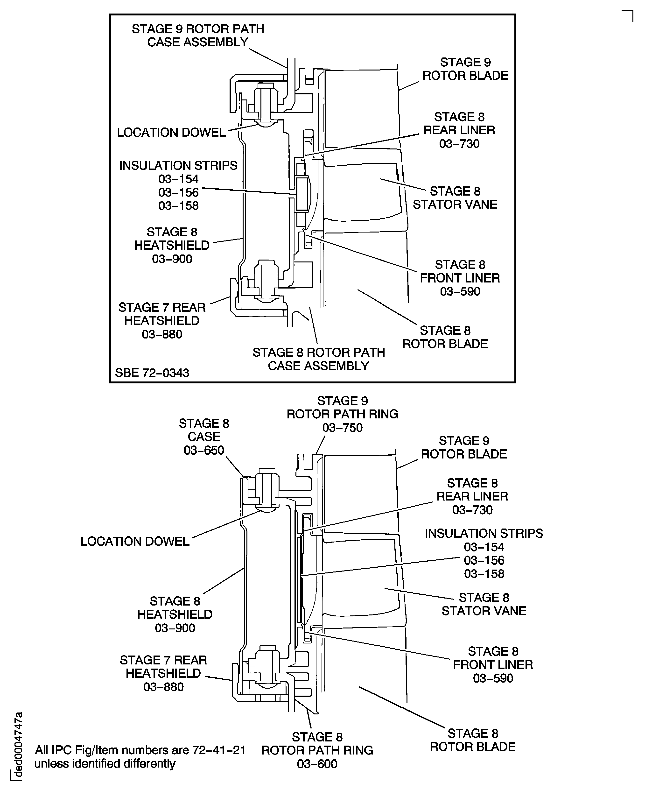 Figure: Pre SBE 72-0343, SBE 72-0343 and SBE 72-0477: Remove the Stage 8 Case, Rotor Path Ring, Stator Vanes and the Stage 7 Case