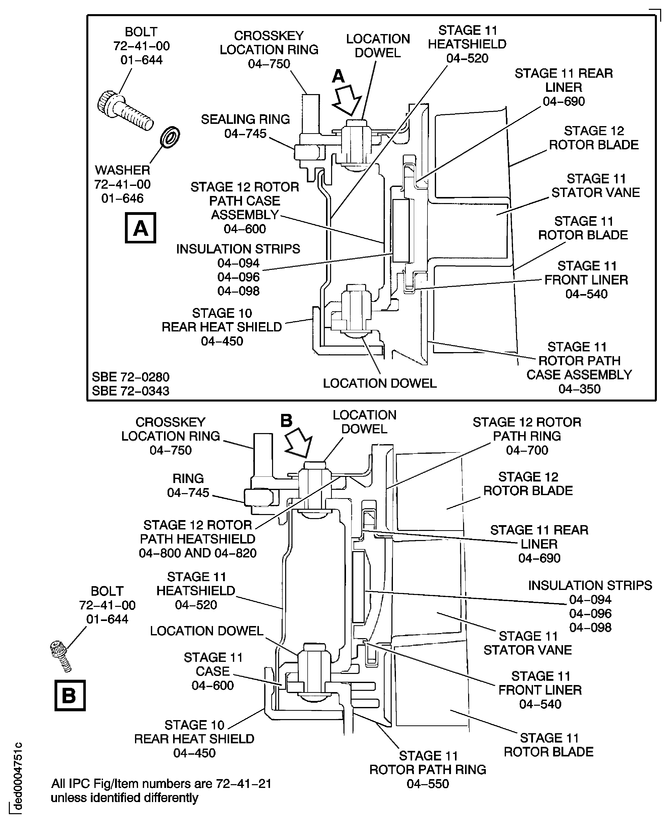 SBE 72-0280, Pre SBE 72-0343, SBE 72-0343 and SBE 72-0477: Remove the Stage 12 Rotor Path Heatshields and the Cross Key Location Seal Carrier and the Stage 11 Stator Vanes
