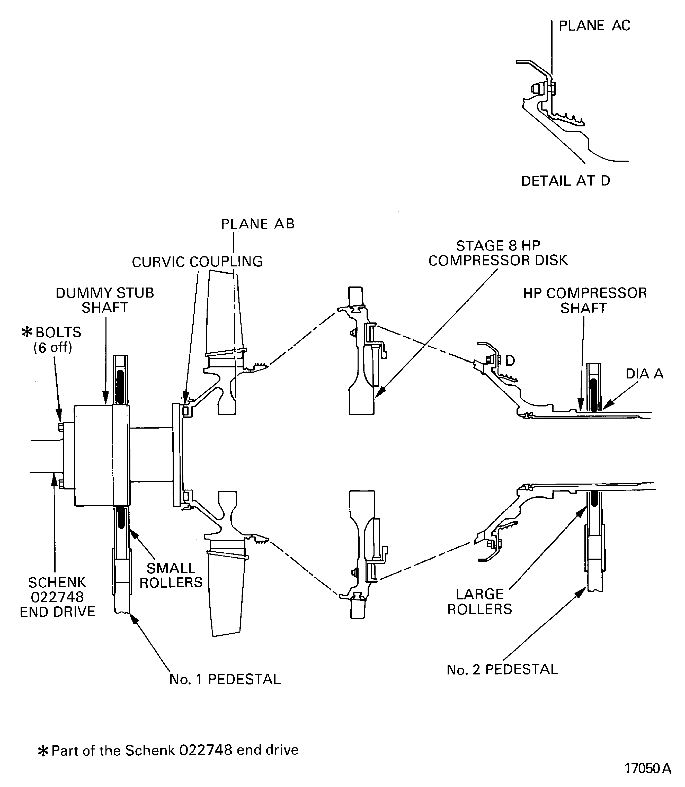 YOU MUST NOT LET THE COMPRESSOR ROTOR ASSEMBLY HIT THE BALANCING MACHINE.Carefully lower the compressor rotor assembly onto the balancing machine. Make sure the dummy stub shaft touches the No. 1 pedestal and the bearing location diameter (Diameter A) touches the No. 2 pedestal. Refer to Figure.